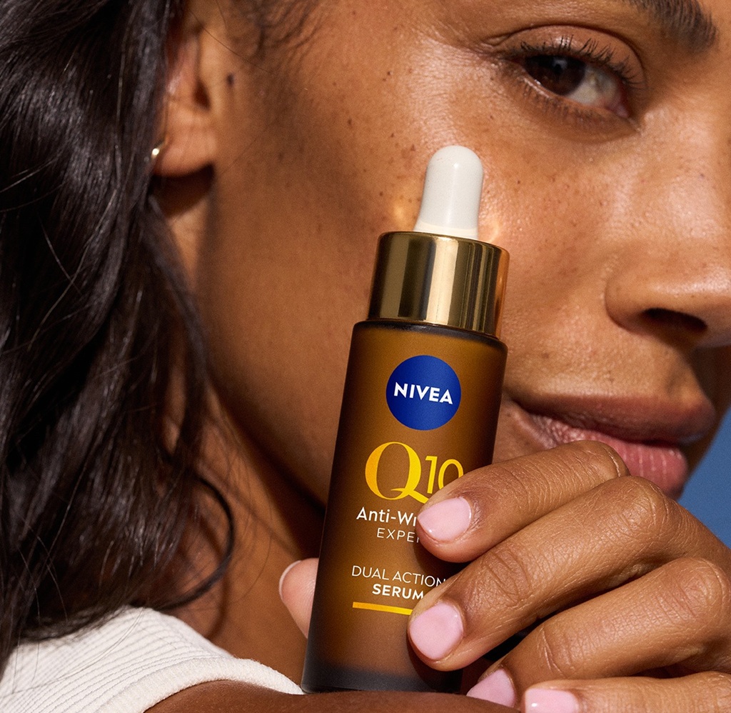 Når huden er ren, er den klar for aktive ingredienser. Her kan et målrettet serum gjøre stor forskjell. NIVEA Q10 Anti-Wrinkle Expert Dual Action Serum er utviklet for å redusere synligheten av selv dype rynker, takket være en kombinasjon av ren Q10 og innovativ Glycostop-teknologi som hjelper til med å beskytte hudens kollagen mot glykering – en naturlig prosess som kan føre til tidlige aldringstegn. Serumet fungerer på rynker i hele ansiktet, særlig rundt øyne og munn, og tilfører rikelig med fukt for en umiddelbart myk og glatt hud.