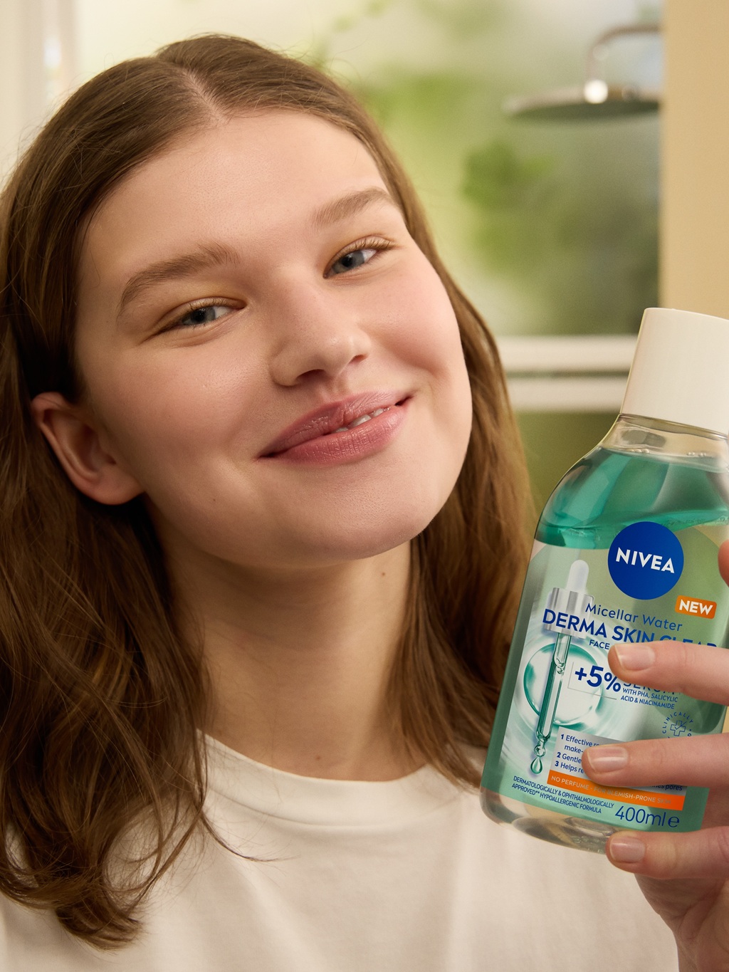Om kvelden bruker man NIVEA Derma Skin Clear Micellar Water for skånsomt å fjerne sminke, SPF og urenheter som har bygget seg opp gjennom dagen. Med PHA, salisylsyre og niacinamid bidrar den til å redusere urenheter, forfine porene og kontrollere olje – uten gniing og uten fet hinne.