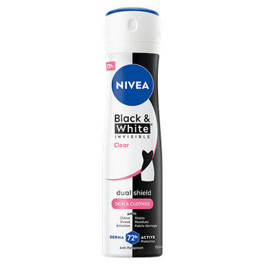 NIVEA Black & White Original 72h Anti-Perspirant Spray gir 72 timers pålitelig antiperspirantbeskyttelse, samtidig som den forebygger hvite merker på svarte klær og gule svetteflekker på hvite klær. Med sin patenterte anti‑stain‑teknologi håndterer den lukt, svette, flekker, rester og irritasjon, og er samtidig skånsom mot huden.