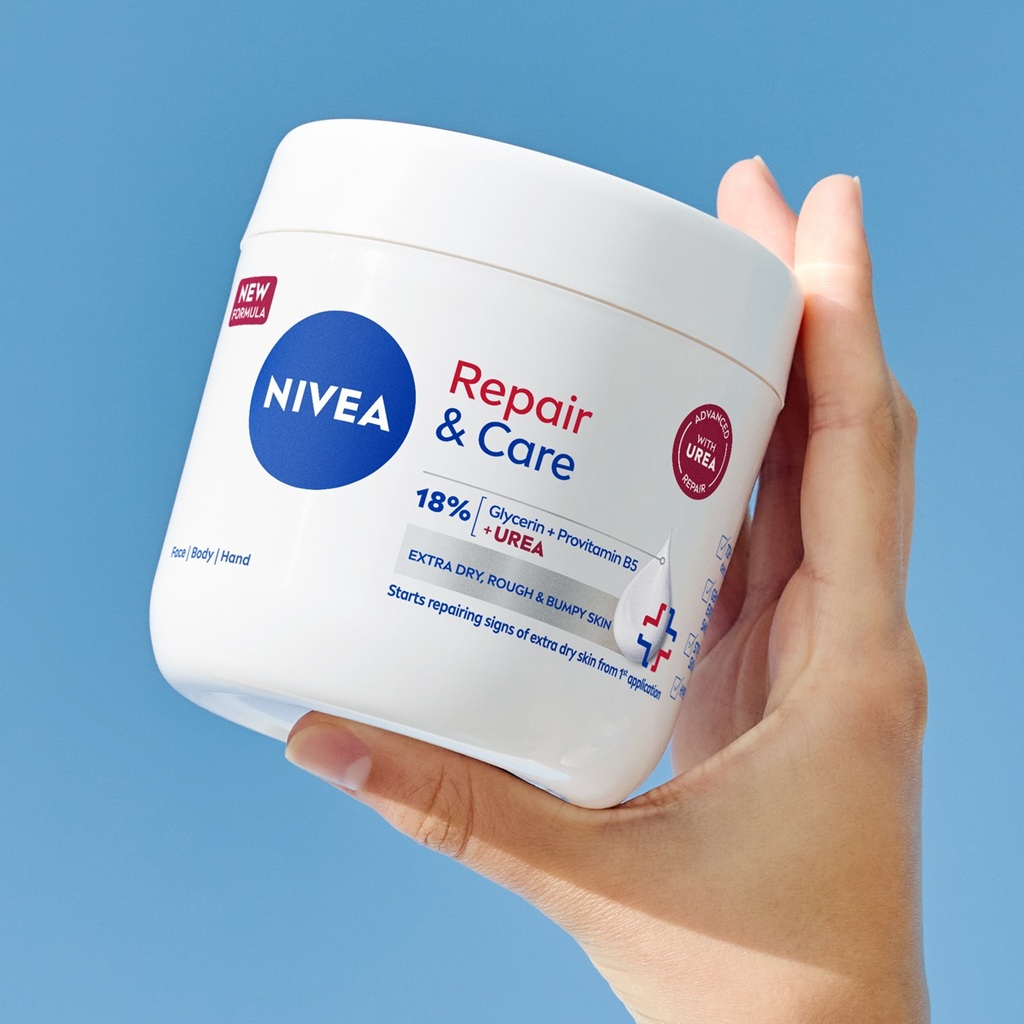 For målrettet pleie ved ekstra tørr og ru hud, prøv NIVEA Repair & Care Cream. Formulert med 15% til 18% av en blanding av glyserin, provitamin B5 og urea, tilfører den dyp fuktighet i epidermis og eksfolierer skånsomt, noe som kan redusere ruhet, kløe og tørrhet. Allerede fra første bruk støtter den hudbarrieren og gjør at huden føles lindret, komfortabel og synlig smidig.