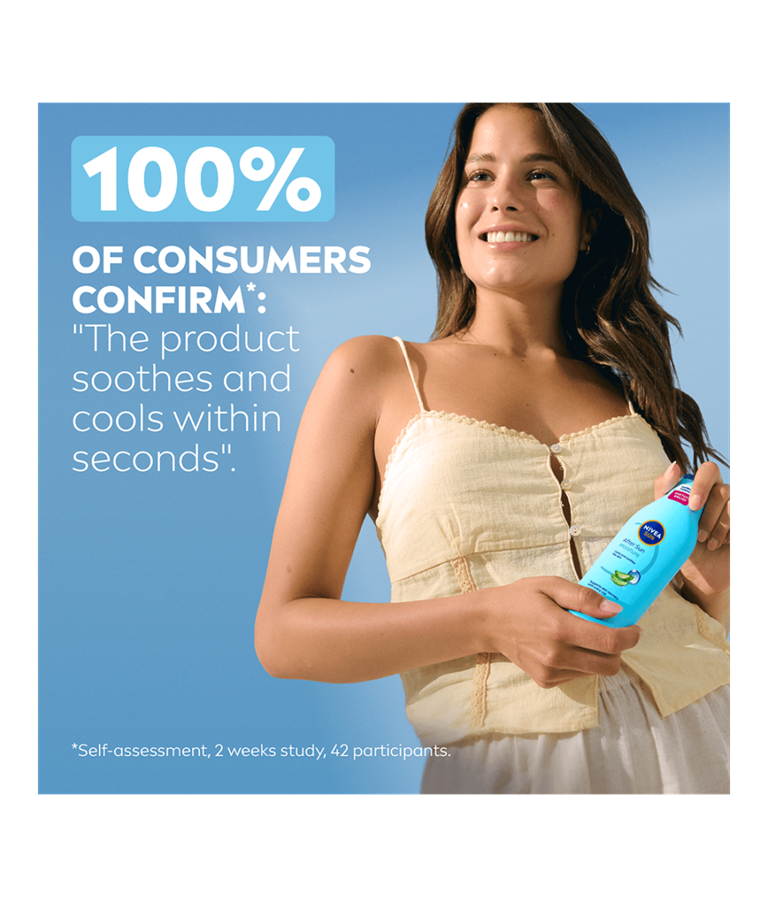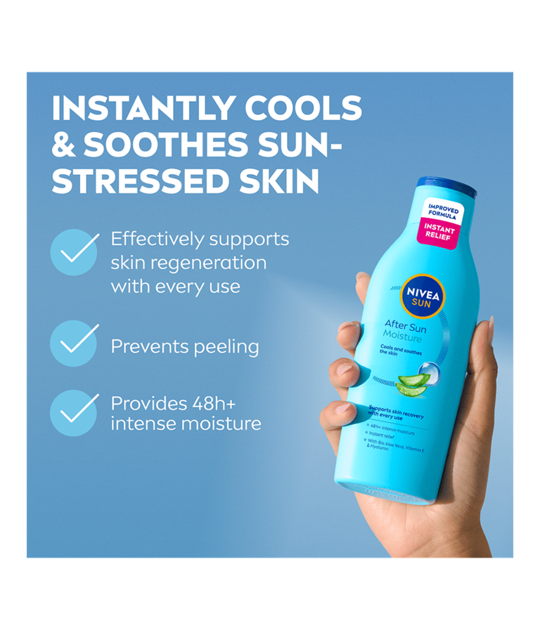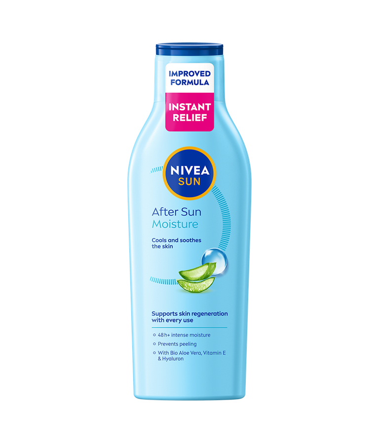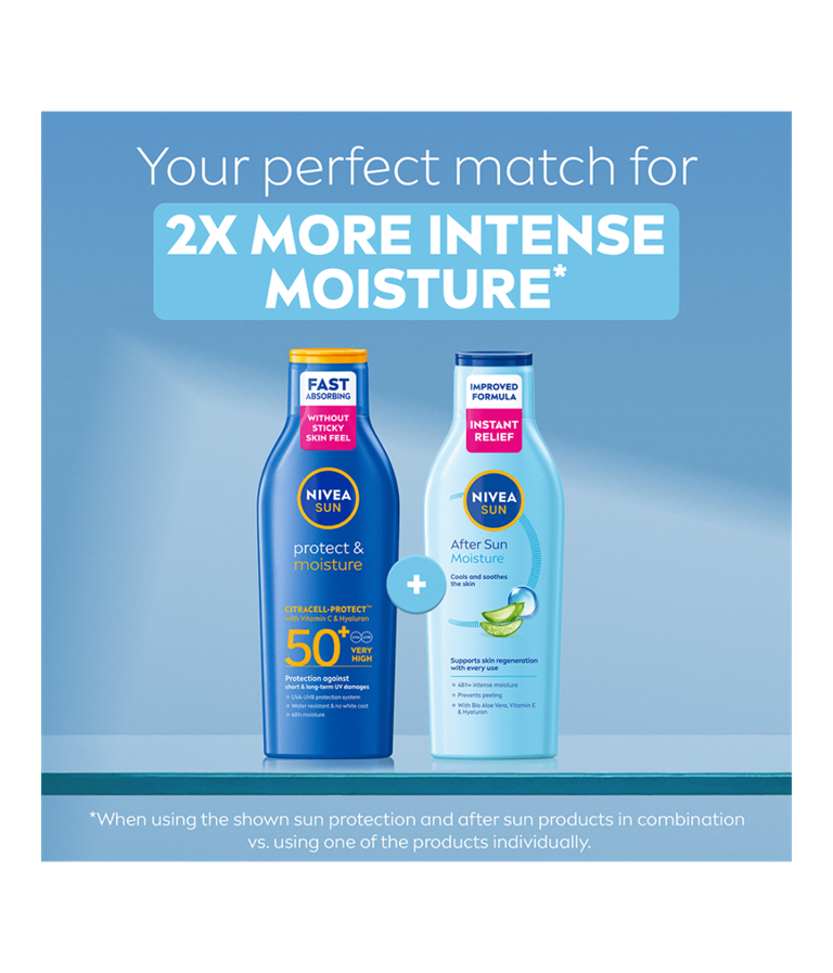 NIVEA SUN After Sun Moisture Lotion med økologisk aloe vera og hyaluron absorberes raskt og har en beroligende, lindrende og fuktighetsgivende effekt på huden – for en vakker brunfarge som varer lenge.