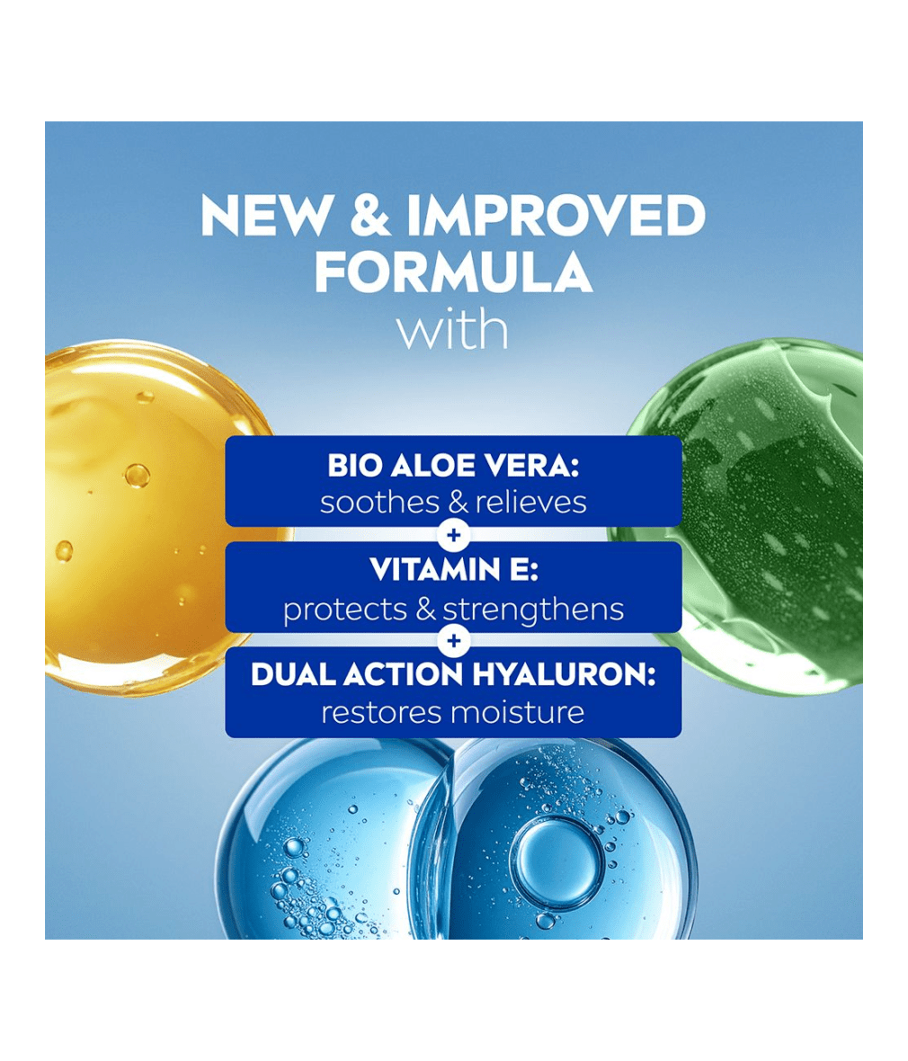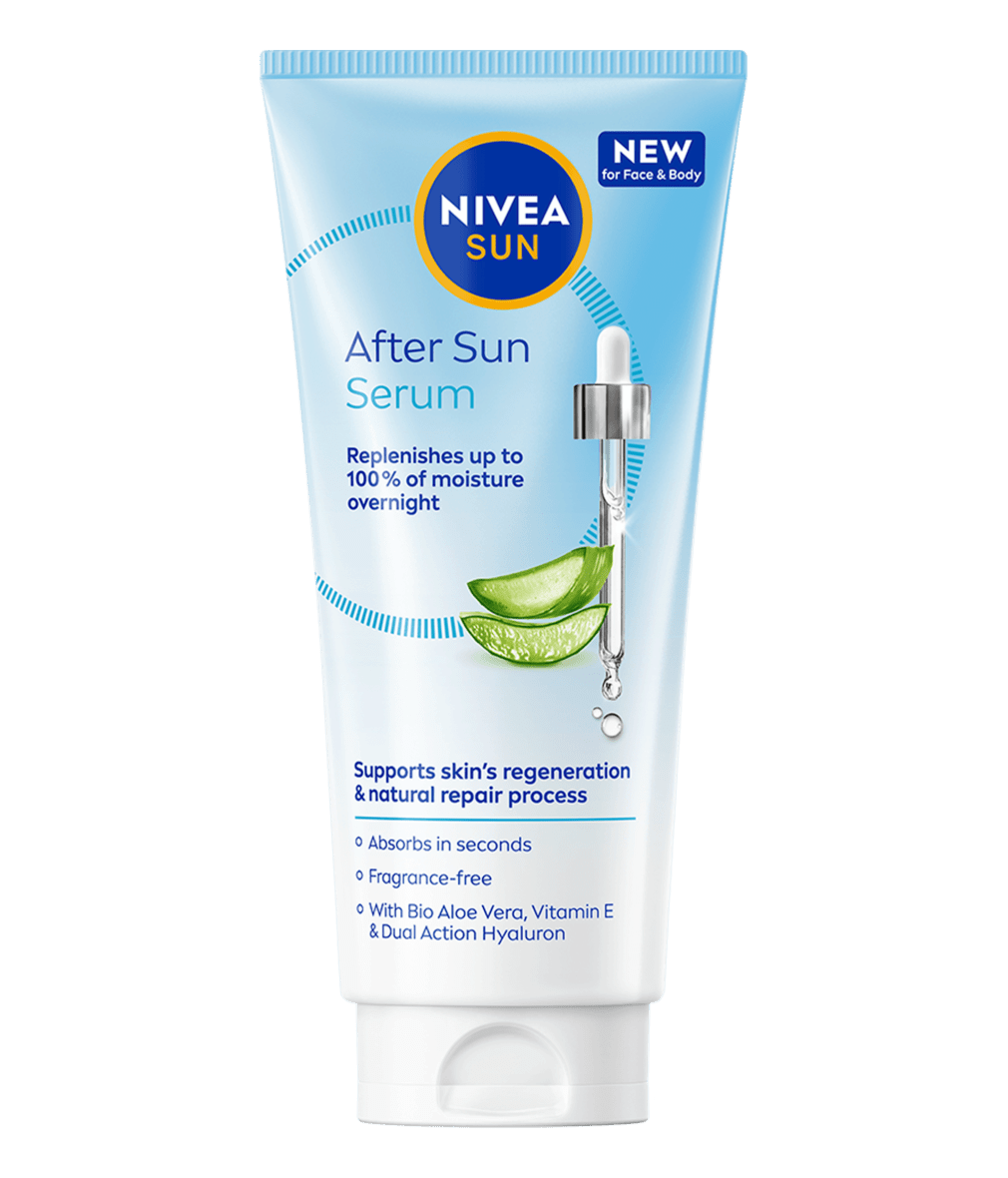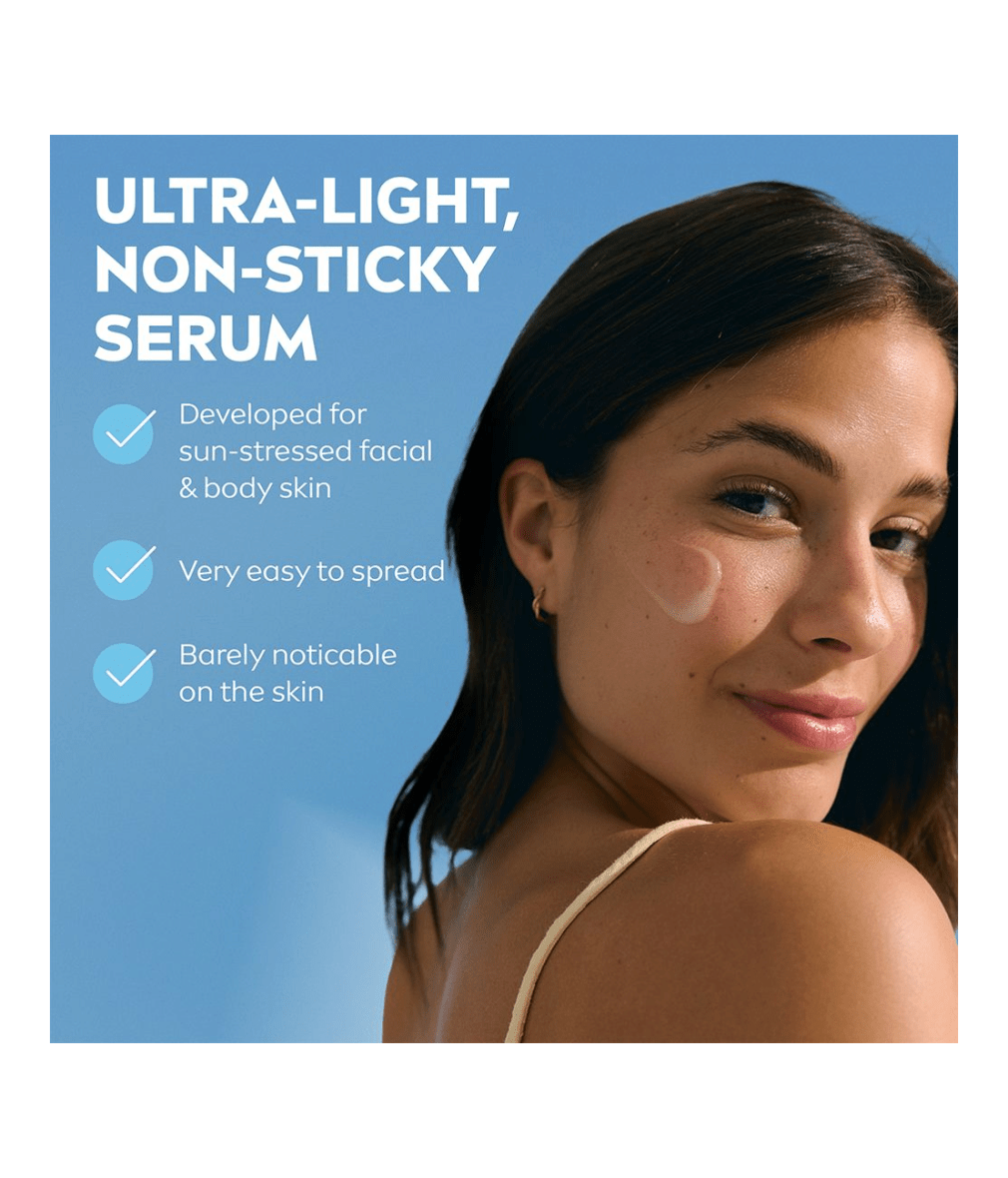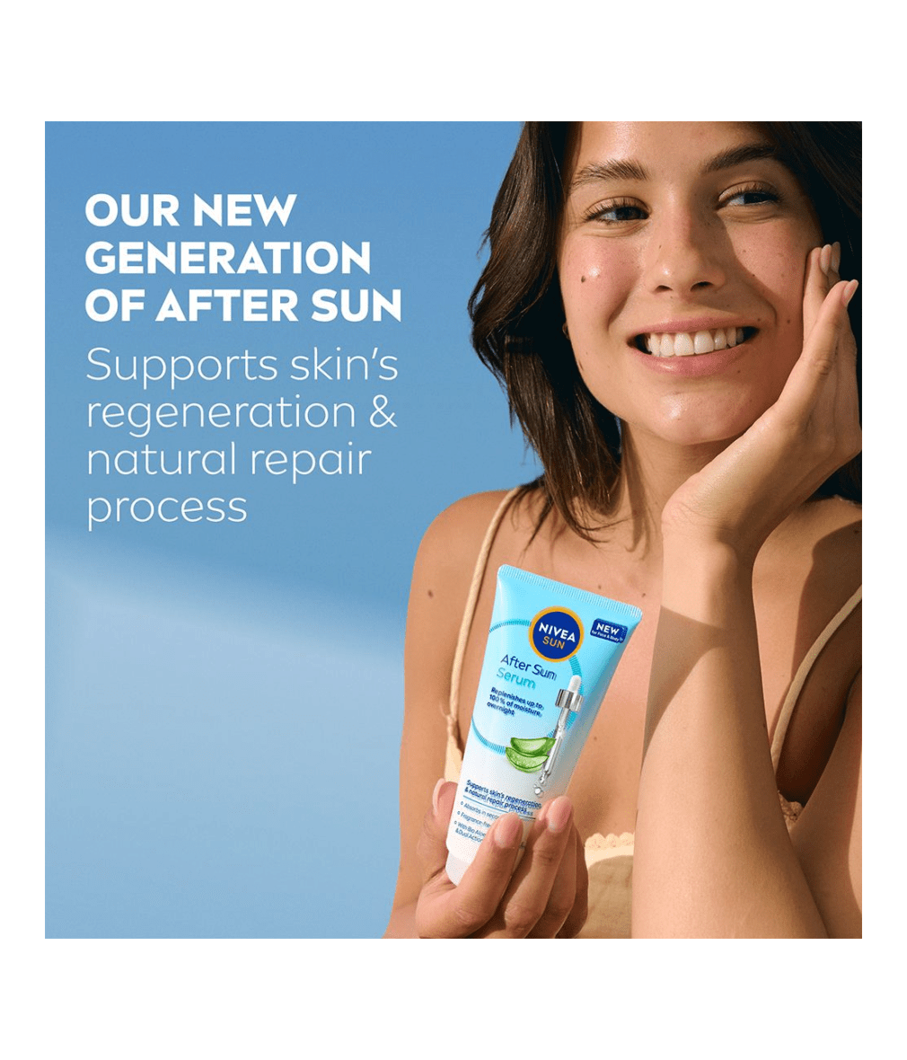 NIVEA SUN After Sun Serum gjenoppbygger fuktighet med opptil 100 % over natten og støtter den naturlige regenererings- og reparasjonsprosessen til solstresset hud – Parfymefri, ultralett formel for ansikt og kropp.
