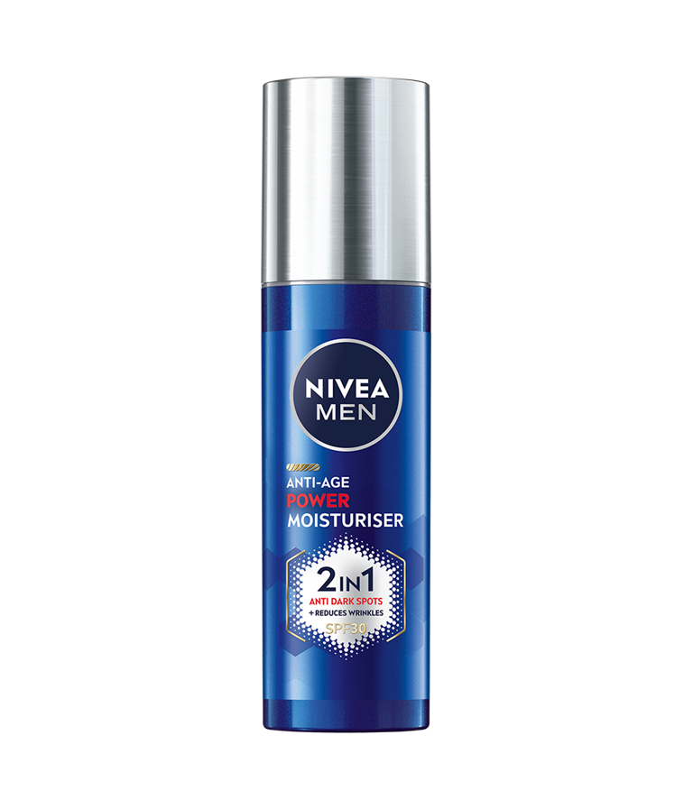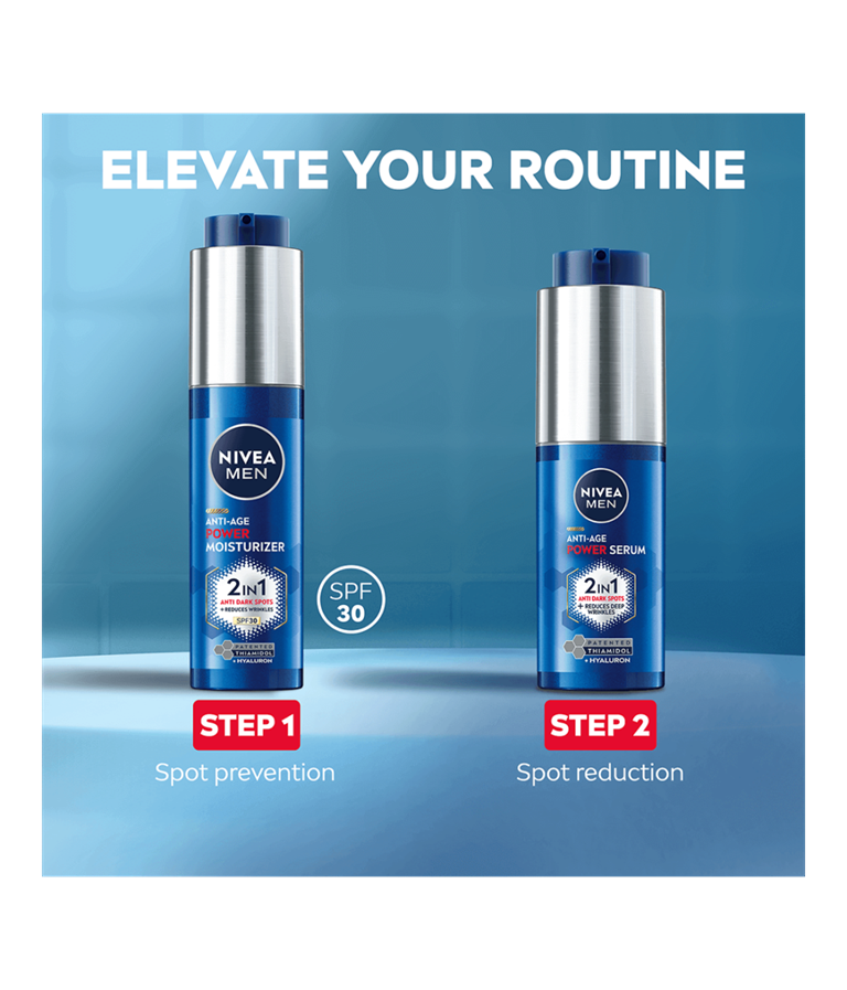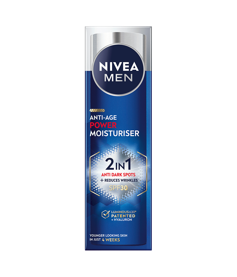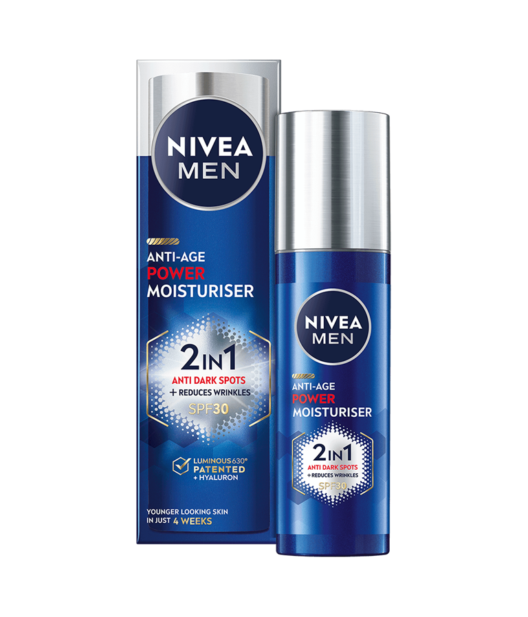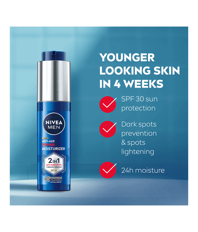 NIVEA MEN Anti-Age Power Moisturiser SPF 30 med patentert Thiamidol® og Hyaluron lysner opp mørke flekker og forhindrer at de kommer tilbake. Den er lett og absorberes raskt, og gir fuktighet for en sunn hud med reduserte aldringstegn.