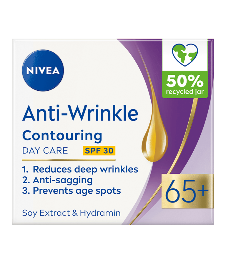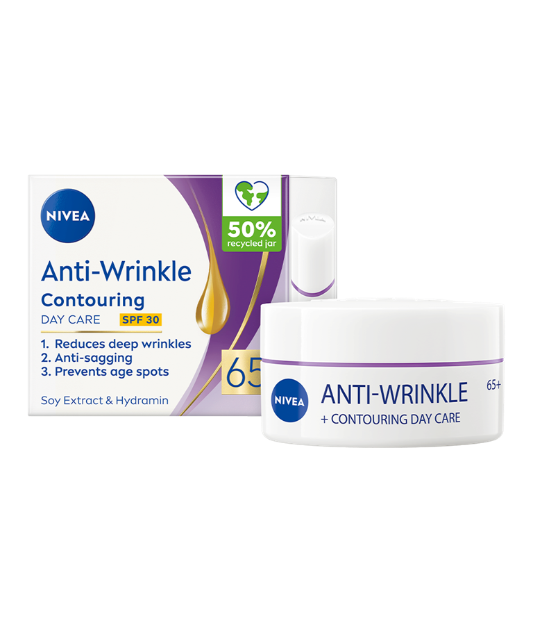 NIVEA Anti-Wrinkle Contouring 65+ Day Cream er en dagkrem for moden hud. Med sin kraftfulle anti-age formel beriket med soyaekstrakt og Hydramin forbedrer den konturene samtidig som den fukter i dybden.