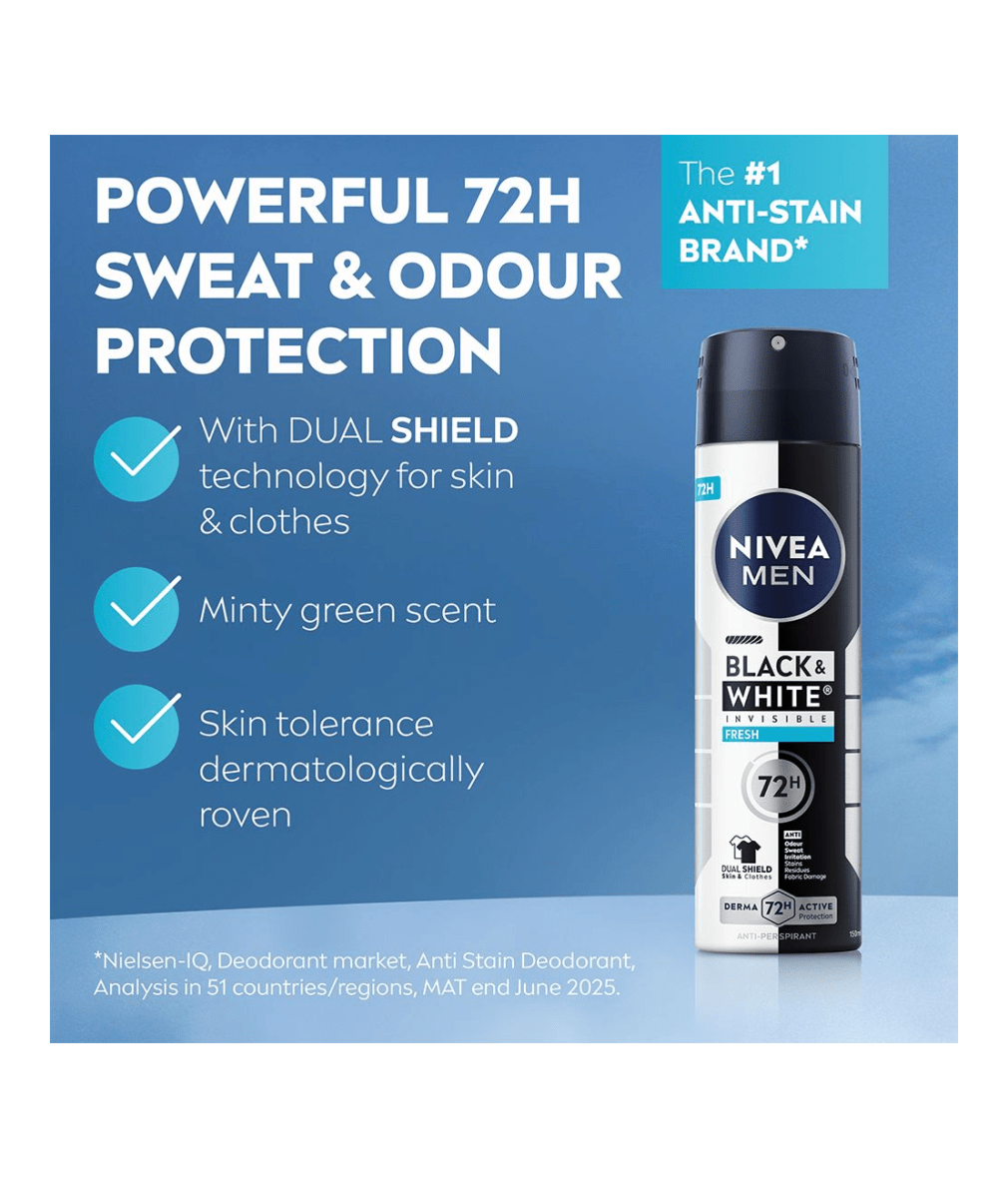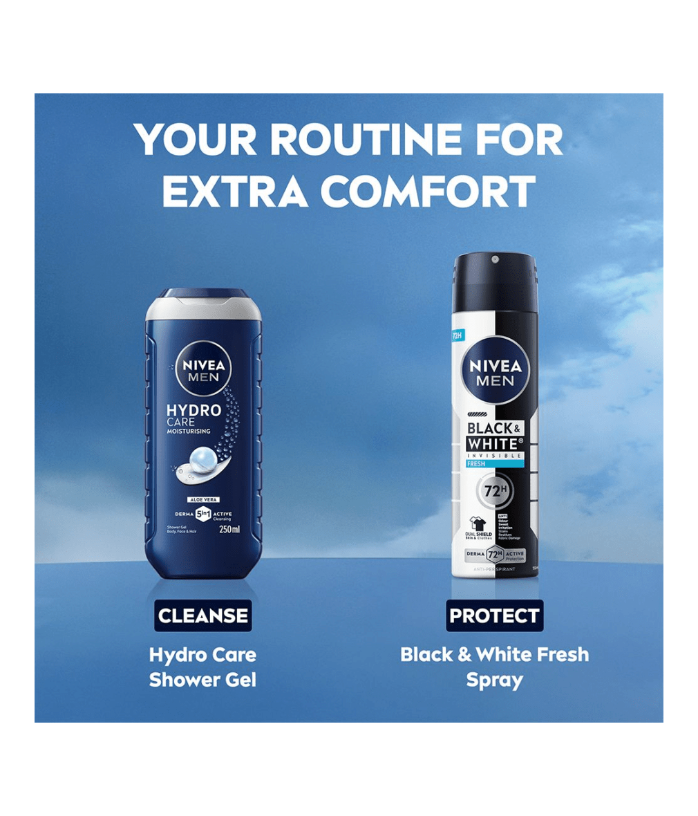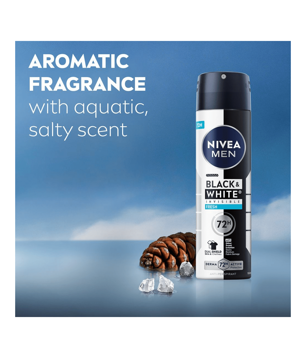 NIVEA MEN Black & White Fresh Spray er en antiperspirantspray som gir en ren og frisk duft som gjør at du føler deg komfortabel hele dagen. Pålitelig 72-timers antiperspirantbeskyttelse.