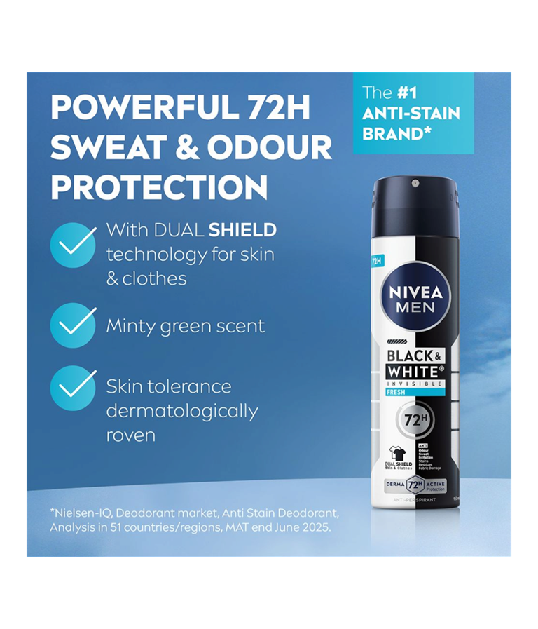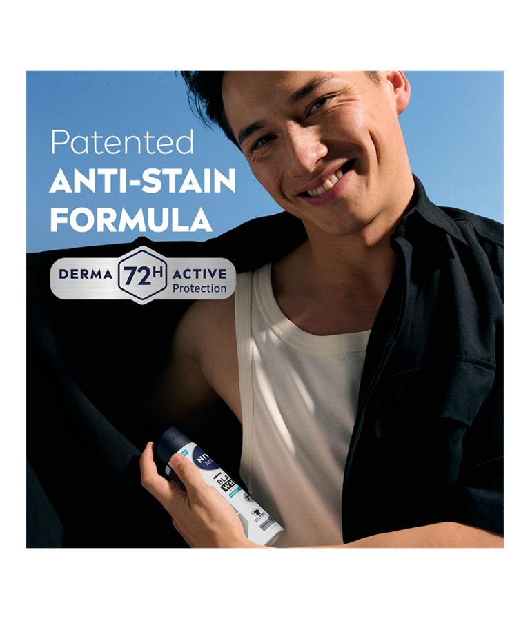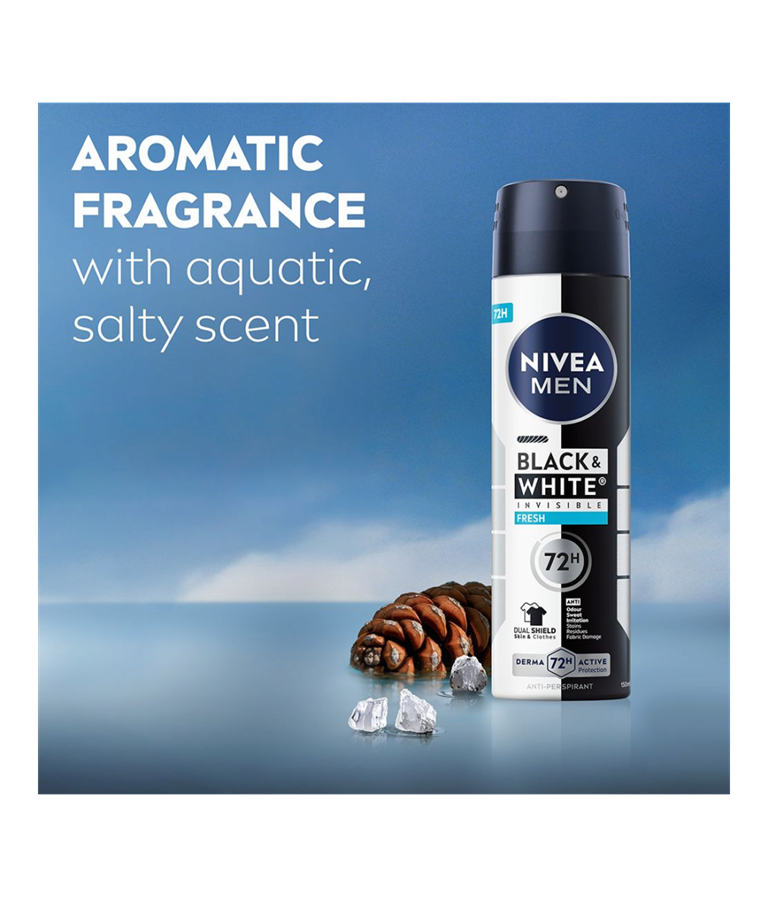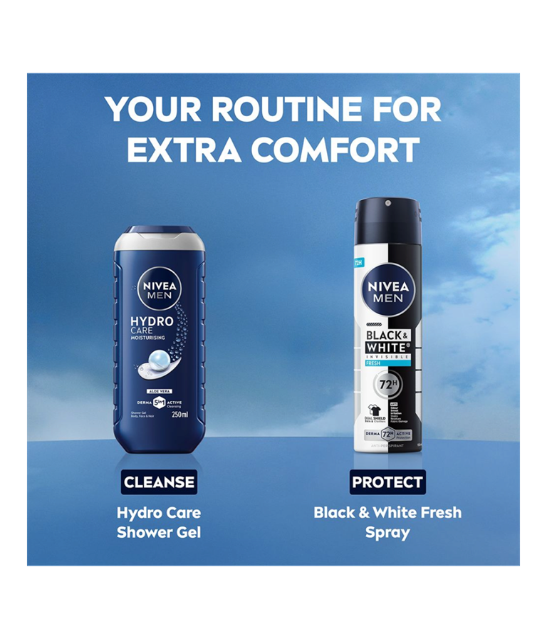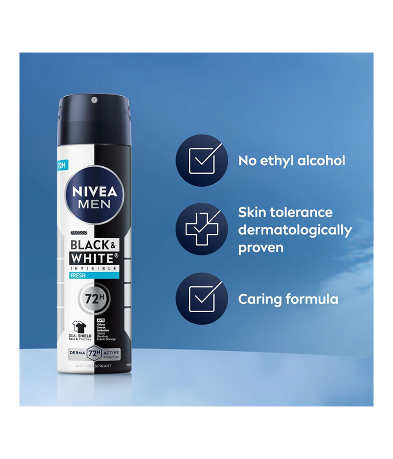 NIVEA MEN Black & White Fresh Spray er en antiperspirantspray som gir en ren og frisk duft som gjør at du føler deg komfortabel hele dagen. Pålitelig 72-timers antiperspirantbeskyttelse.