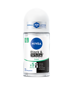 NIVEA Black & White Invisible-serien gir beskyttelse mot hvite merker på svarte klær og mot gule flekker på hvite klær takket være sin unike patenterte teknologi mot flekker. Det er en pålitelig 72 timers antiperspirantbeskyttelse, sterk mot svette og lukt, som tar vare på huden din.