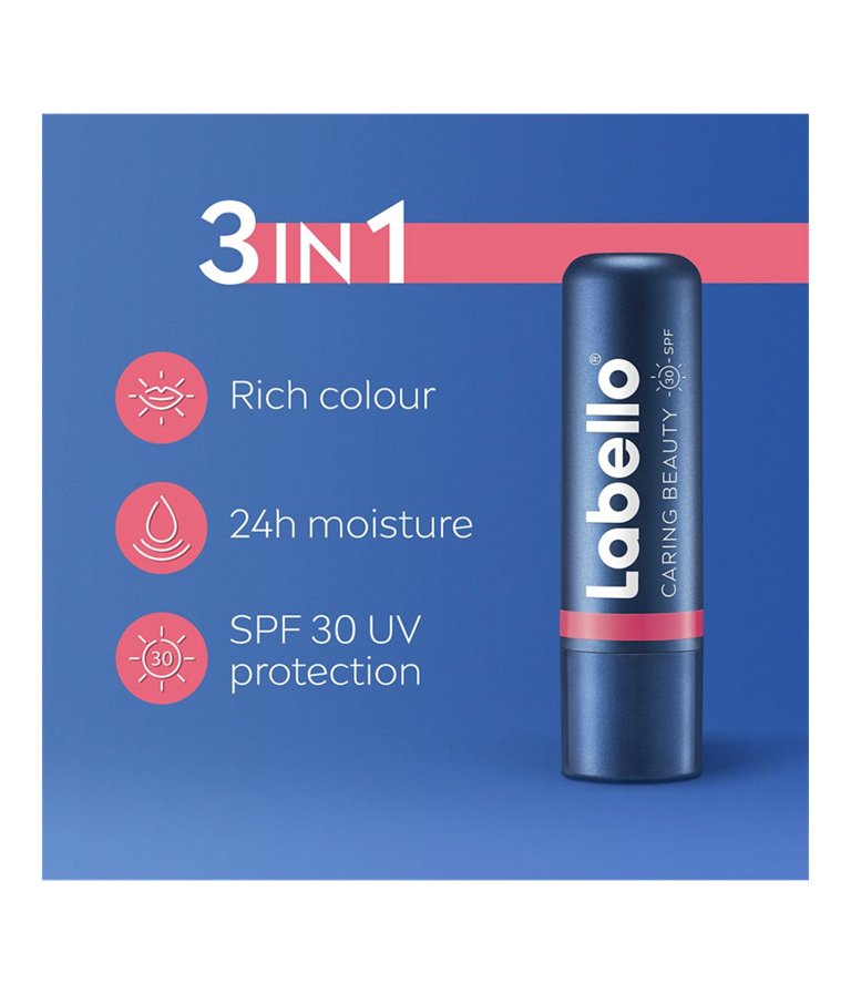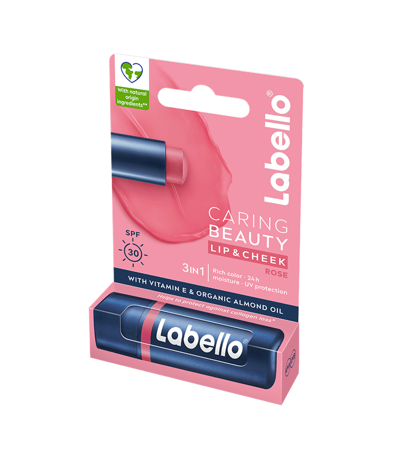 Caring Beauty Rose-Nude – farget leppe- og kinnbalsam med 3-i-1-formula som gir intensiv farge, 24 timers fuktighetspleie og beskyttelse mot kollagentap med SPF30. Den nye Caring Beauty-serien består av ulike farger, som også kan kombineres for å skape nye unike nyanser!