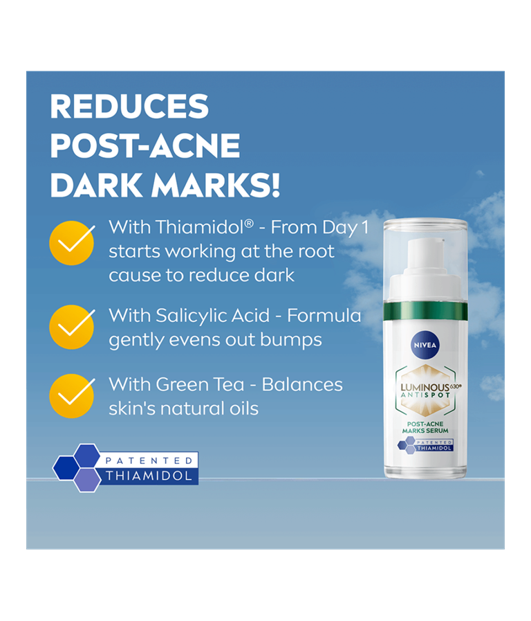 Få vakker strålende hud med NIVEA Luminous630 Post-Acne Marks Serum. Reduserer synlige mørke flekker og jevner ut hudtonen for en strålende finish.