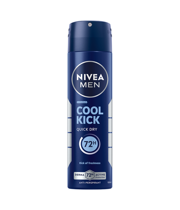 NIVEA MEN Cool Kick Quick Dry Antiperspirant gir et spark av oppfriskende friskhet med sin Cool-Care-formel. Pålitelig 72t antiperspirantbeskyttelse som tar vare på huden din.