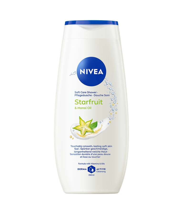 NIVEA Starfruit & Monoi Oil Care Shower er en dusjkrem som gir næring til huden og gjør den myk. Formelen er beriket med vitamin C, E og oljer, og har en herlig duft av stjernefrukt.