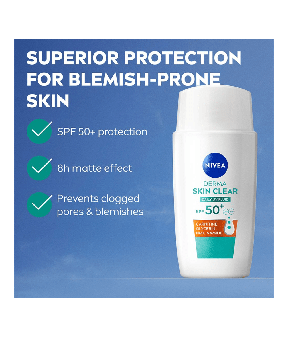 Begynn din reise mot velvære hud med NIVEA Derma Skin Clear Daily UV Fluid. Formelen med Karnosin, Glycerin og Niacinamid er spesielt utviklet for akneutsatt hud og er perfekt under sminke. Gir 8 timers nedmattet hud og forhindrer tette porer og blemmor.