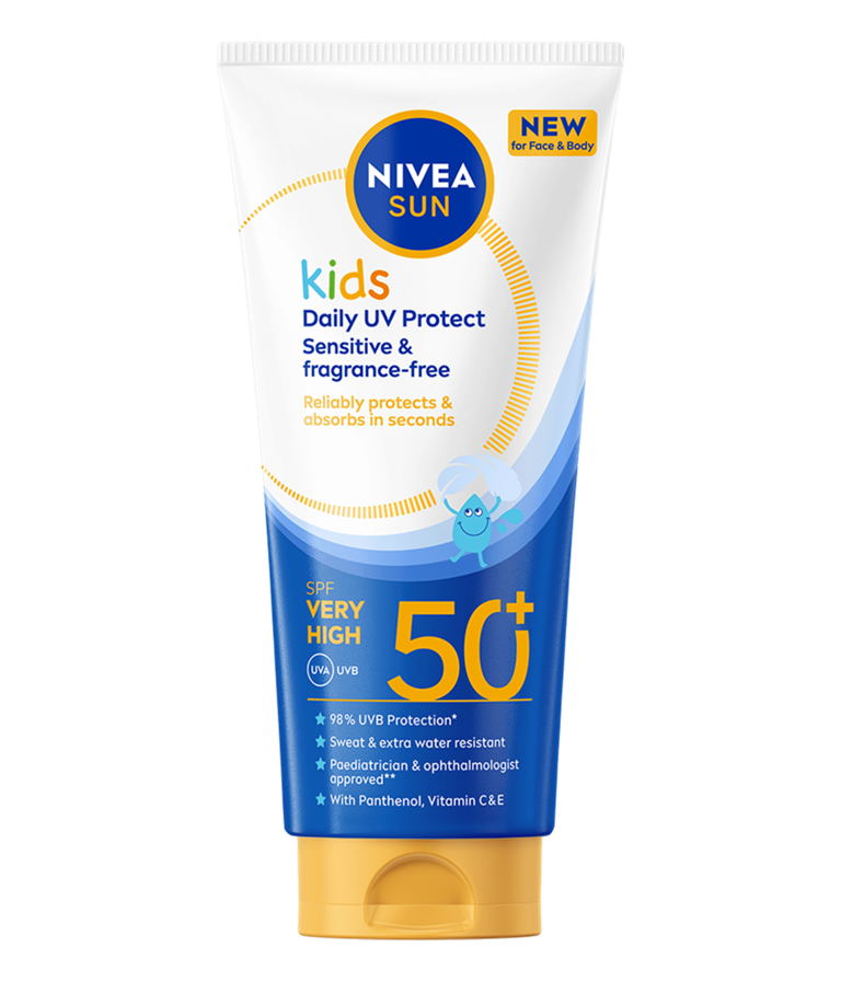 NIVEA SUN Kids Daily UV Protect SPF50+ er en solkrem med svært høy beskyttelsesfaktor, spesielt utviklet for barns sensitive hud. Kremen er helt parfymefri, absorberes raskt og etterlater huden myk uten å være klissete. Den er både svette- og vannavstøtende, noe som gjør den perfekt for daglig bruk.