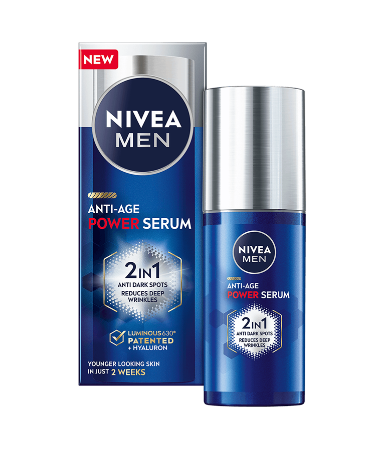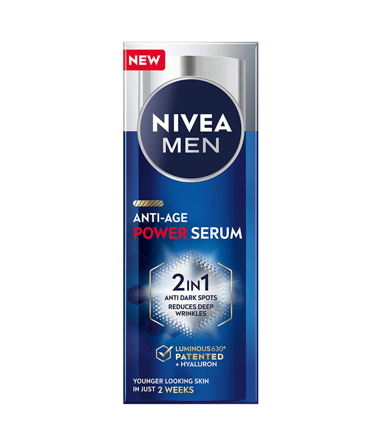 NIVEA MEN Anti-Age 2in1 Power Serum er et fuktighetsgivende serum som motvirker tegn på aldring av huden og reduserer pigmentflekker. For en mer ungdommelig hud på bare 2 uker!