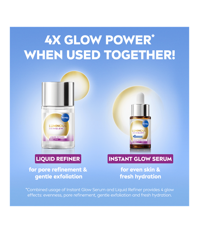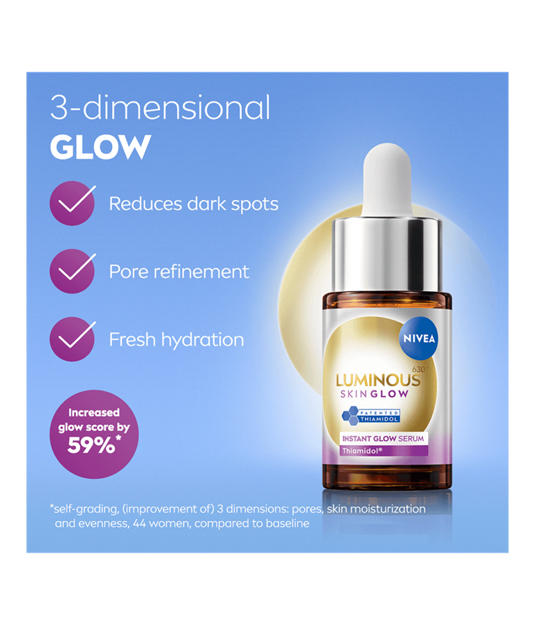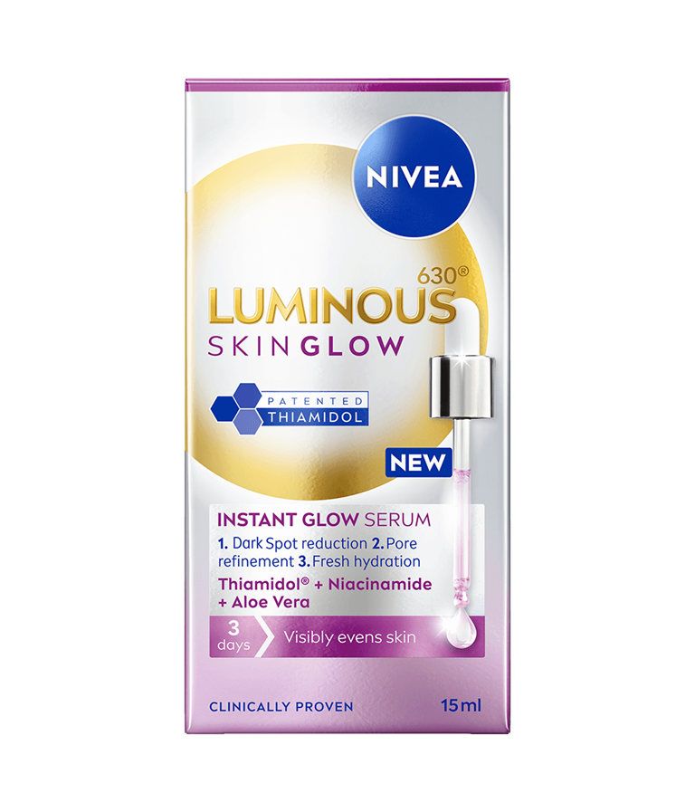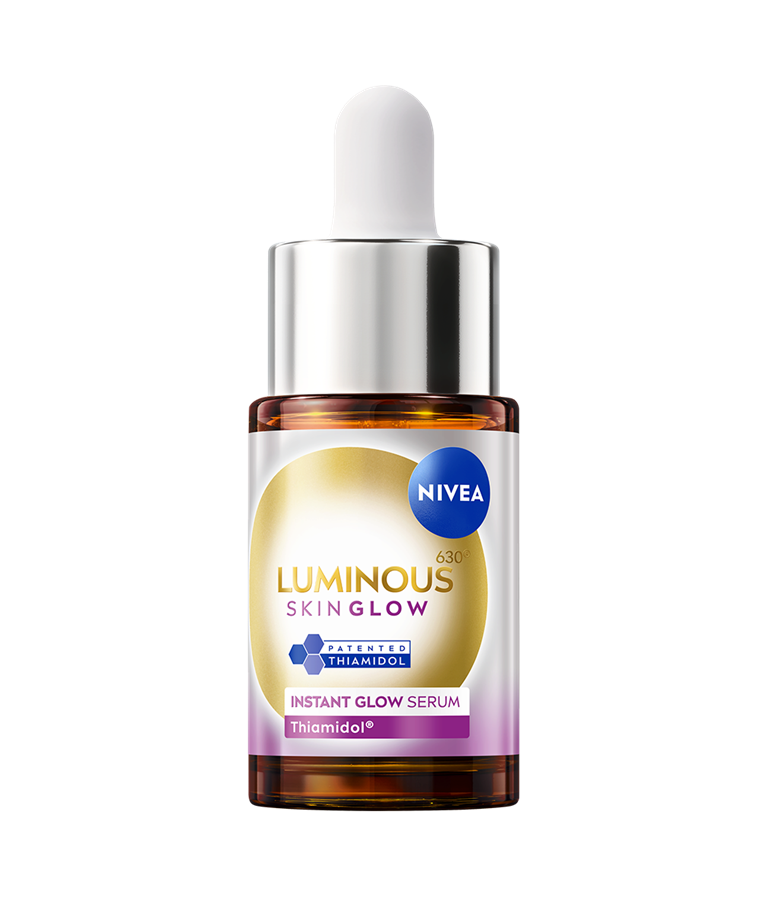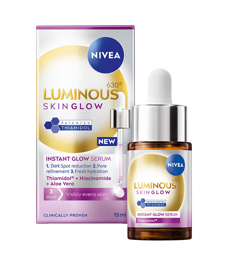 LUMINOUS630® SKIN GLOW Instant Glow Serum er NIVEAs første produkt som tar for seg hudens glød. 2 ganger mer strålende hud etter 2 uker (egenvurdering, 42 kvinner). Innovativ formel med Thiamidol®, vår mest effektive ingrediens mot mørke flekker.