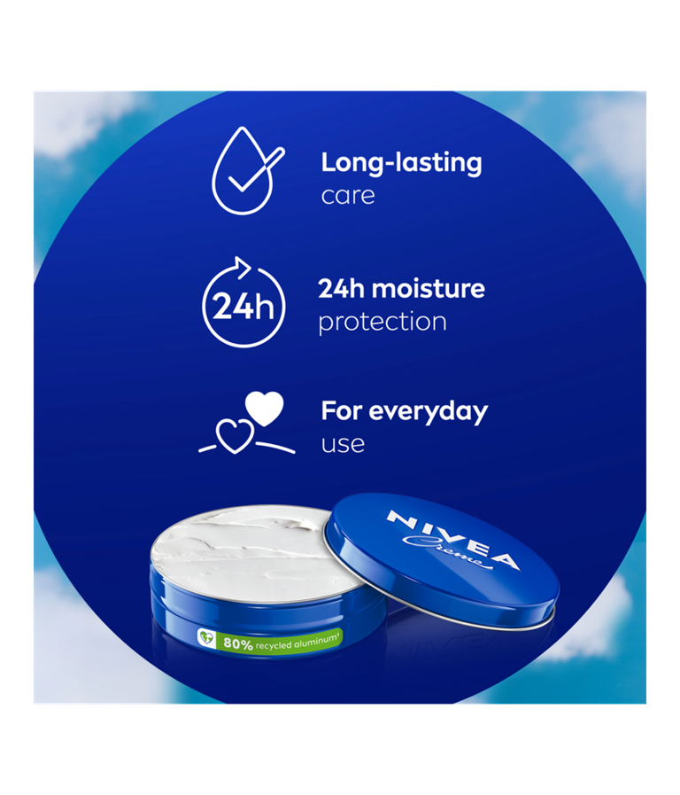 NIVEA Creme er perfekt for hele kroppen og er egnet for daglig bruk. Kan med fordel brukes på for eksempel albuer, knær, hender og ansikt – og passer til hele familien; både voksne og barn. Dermatologisk testet.