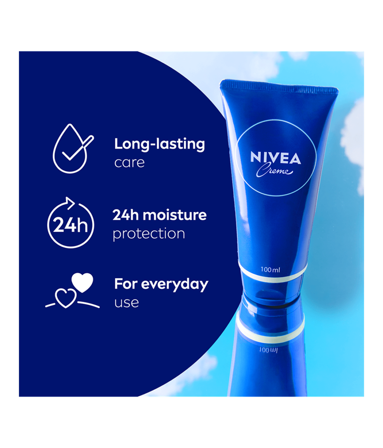 NIVEA Creme Tube er NIVEAs ikoniske hudkrem, nå i tube, og er velegnet til hele familien og overalt på kroppen! Fuktighetskremen er perfekt til daglig bruk når huden trenger pleie.