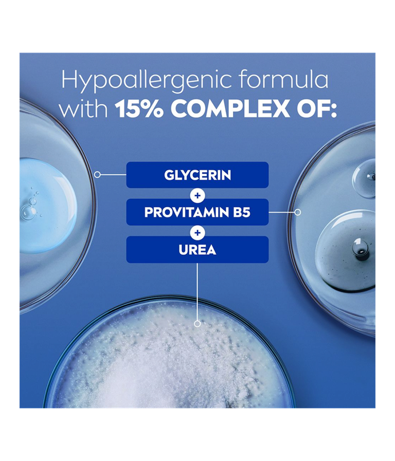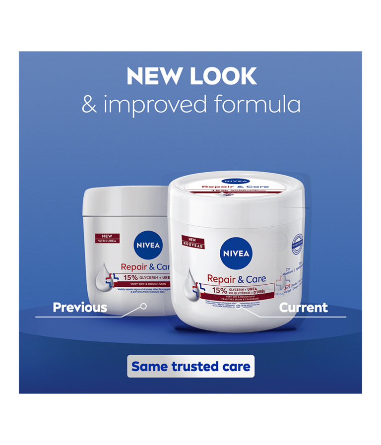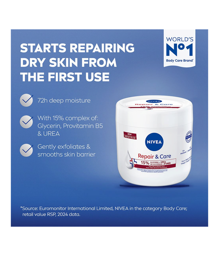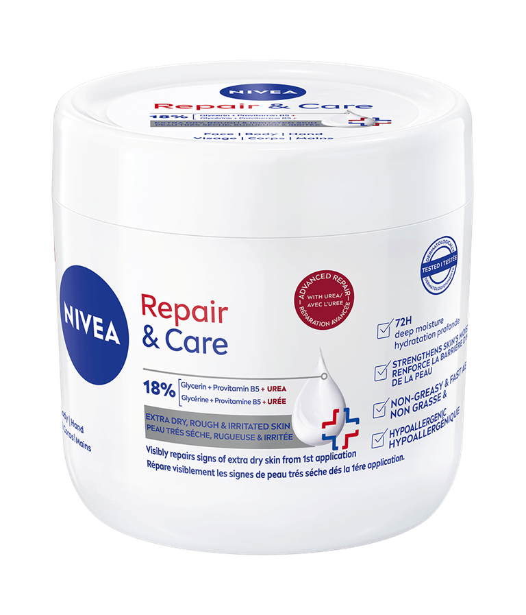 NIVEA Repair & Care Body Cream UREA begynner å reparere tørr hud fra første påføring. Den fukter huden i dybden i opptil 72 timer og styrker hudbarrieren samtidig som den eksfolierer skånsomt for myk og glatt hud. Hypoallergenisk, ikke-fet og absorberes raskt.