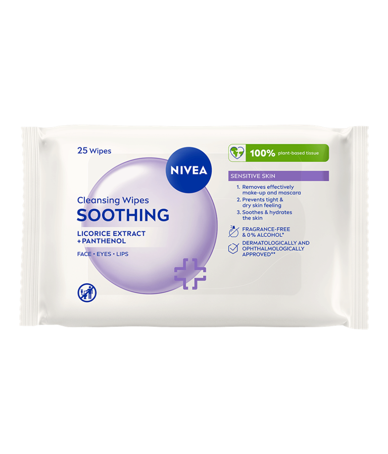 NIVEA Soothing Cleansing Wipes er pleiende, plantebaserte renseservietter med en ekstra mild formel beriket med lakrisekstrakt og panthenol som er skånsom mot huden og beskytter fuktighetsbalansen. De fjerner effektivt og skånsomt selv vannfast sminke og mascara, og etterlater huden din frisk og vakker.
