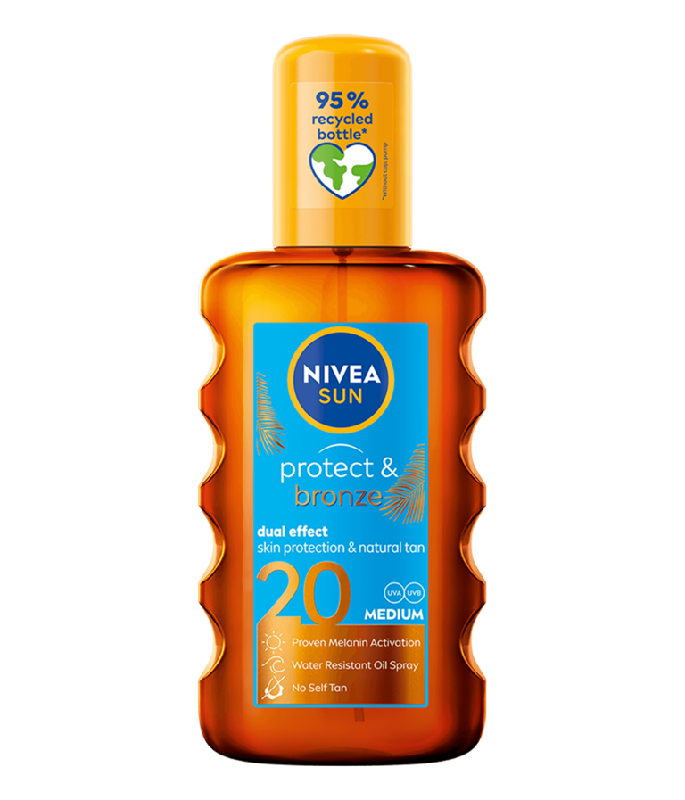 NIVEA SUN Protect & Bronze Oil Spray SPF 20 er solbeskyttelsen som gir en fin og jevn brunfarge. Denne solsprayen har dobbel effekt: den beskytter huden mot UV-stråler + gir en naturlig brunfarge gjennom dokumentert melaninaktivering.