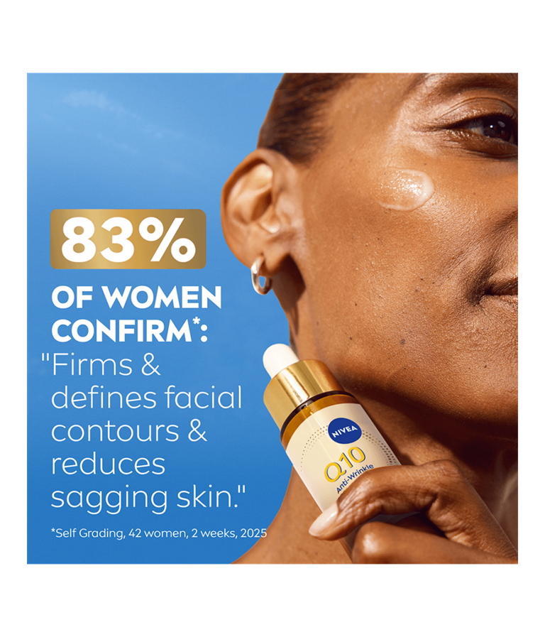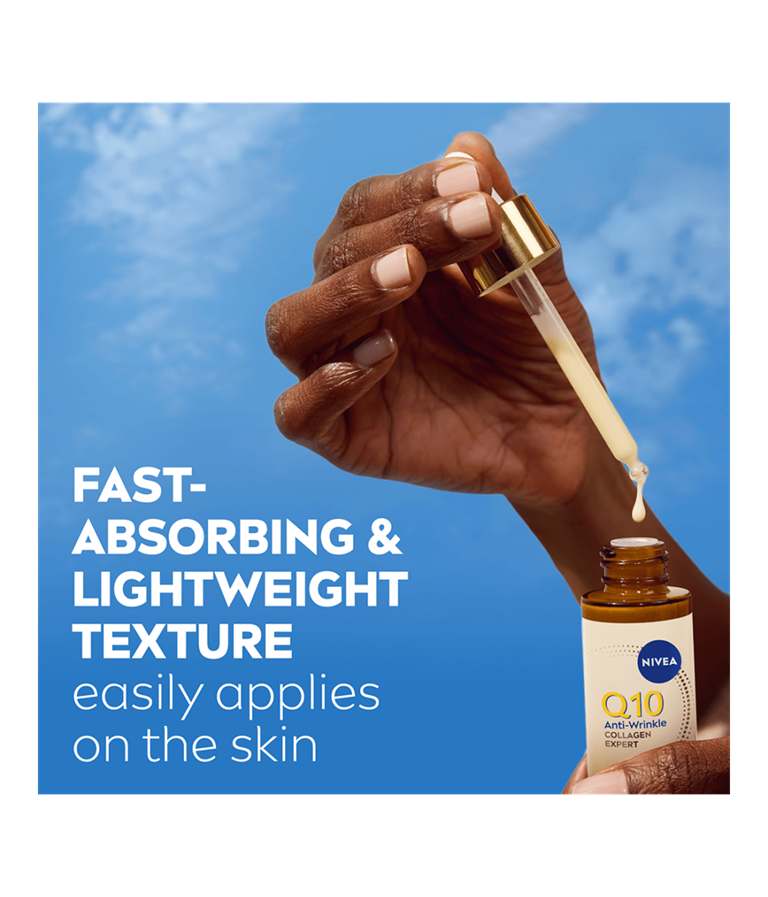 NIVEA Q10 Anti-Wrinkle Collagen Expert 3in1 Repairing Serum er beriket med ren Q10, kollagenpeptider og ceramider, som effektivt forbedrer hudens elastisitet, reduserer dype rynker og styrker hudbarrieren.
