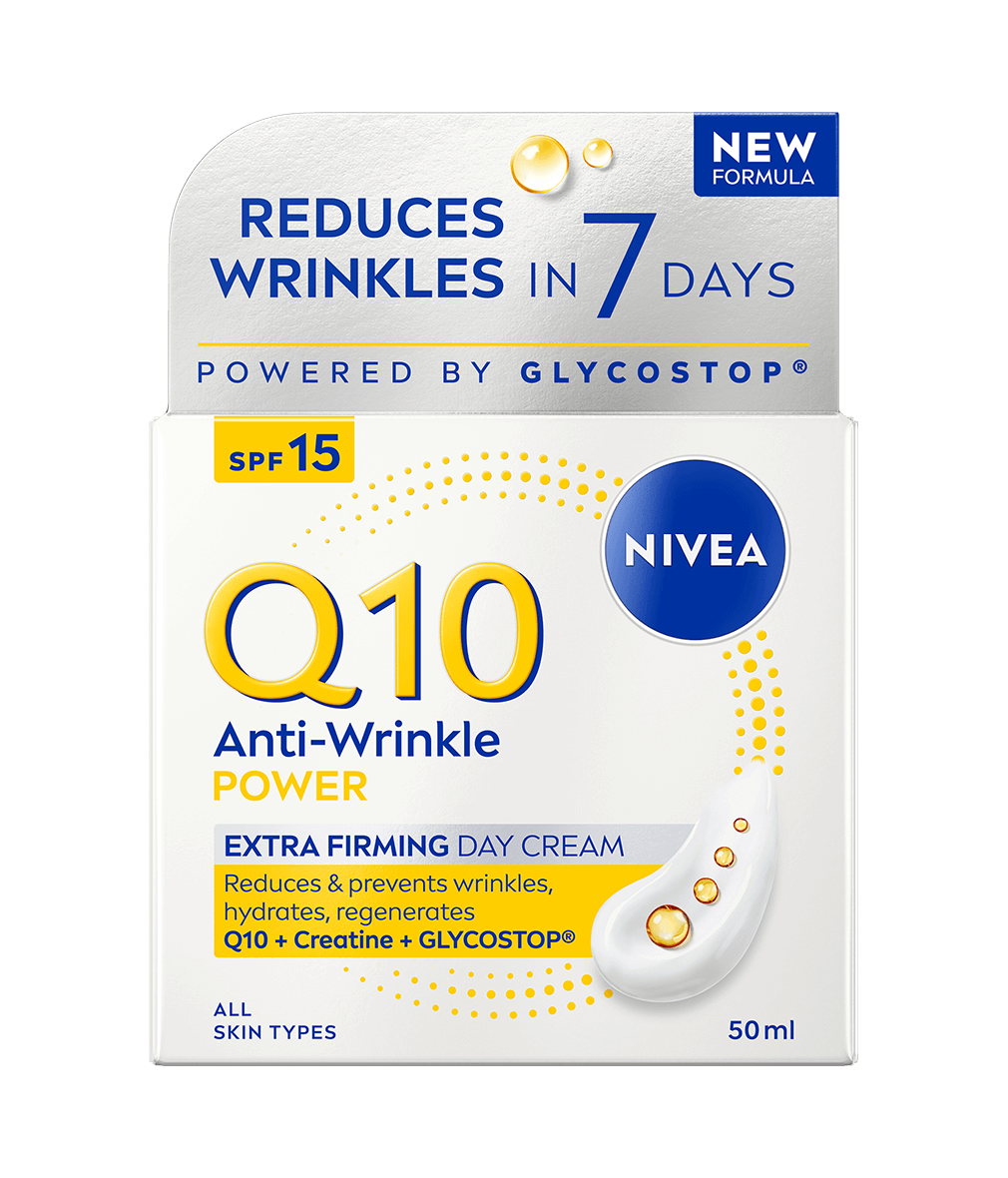 NIVEA Q10 Anti-Wrinkle Power Extra Firming Day Cream med SPF15 er en dagkrem som intensivt gir næring og fukt til huden og reduserer rynker, for en myk hudfølelse og fastere hud. Inneholder dobbel kollagenbooster med ren Q10 og kreatin, Glycostop og hyaluronsyre.