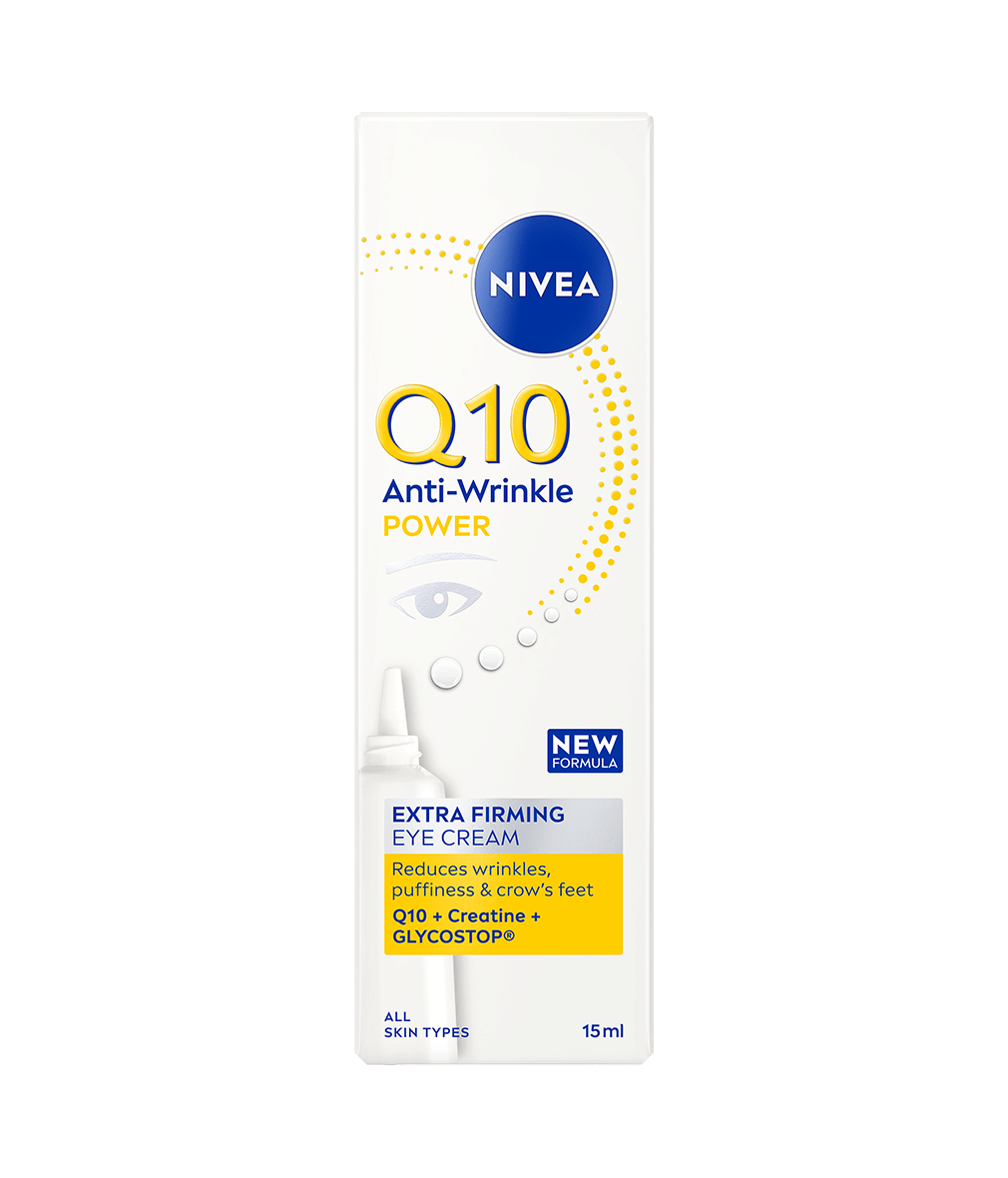 NIVEA Q10 Anti-Wrinkle Power Extra Firming Eye Cream er en raskt absorberende øyekrem med en lett formel, spesielt utviklet for det sensitive øyeområdet. Beriket med ren Q10, kreatin, glycostop og hyaluronsyre, reduserer den rynker, poser og kråketær.
