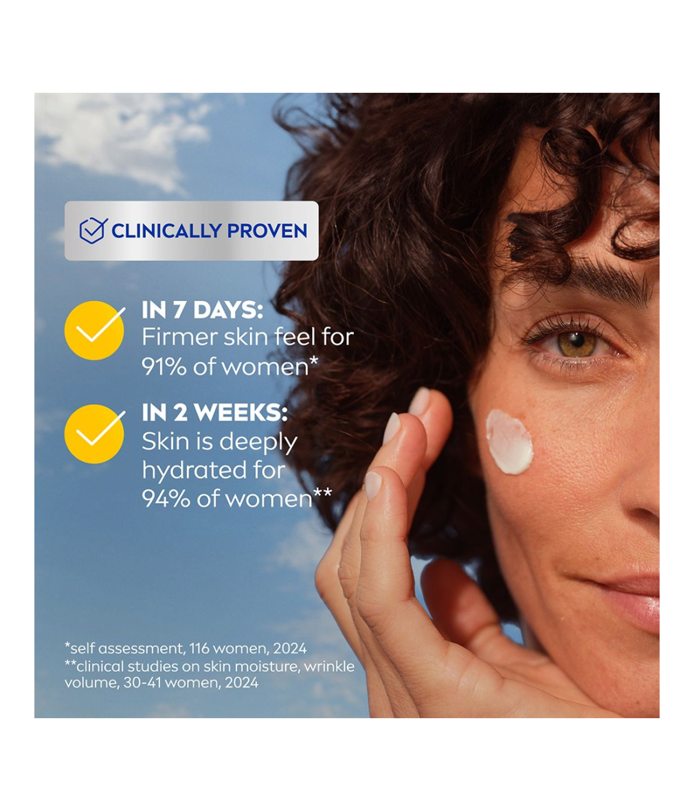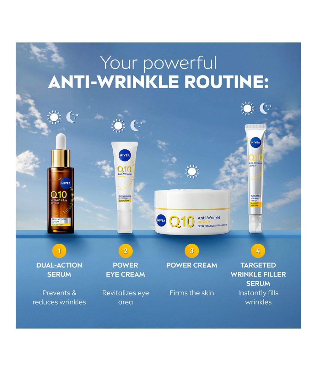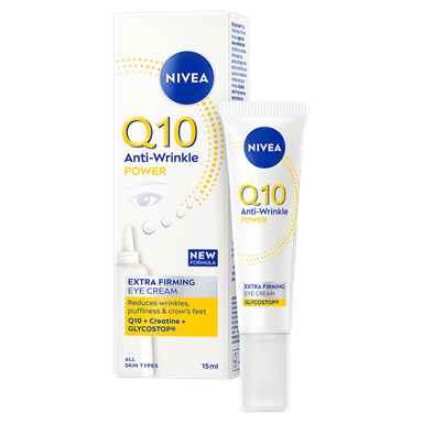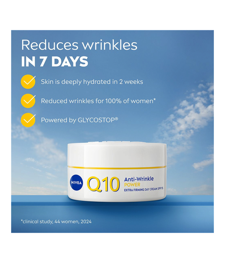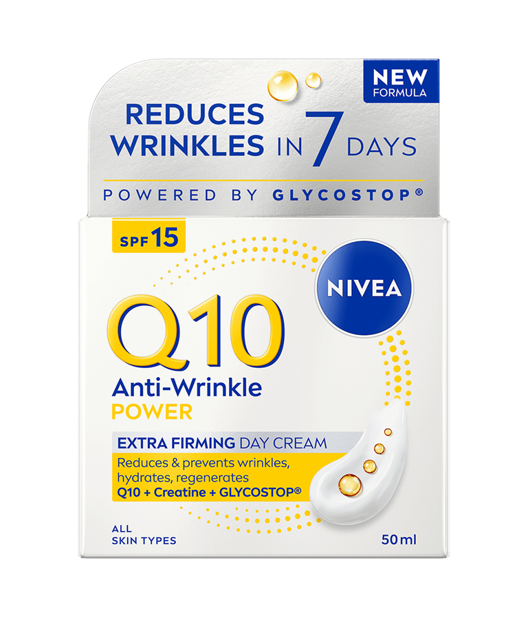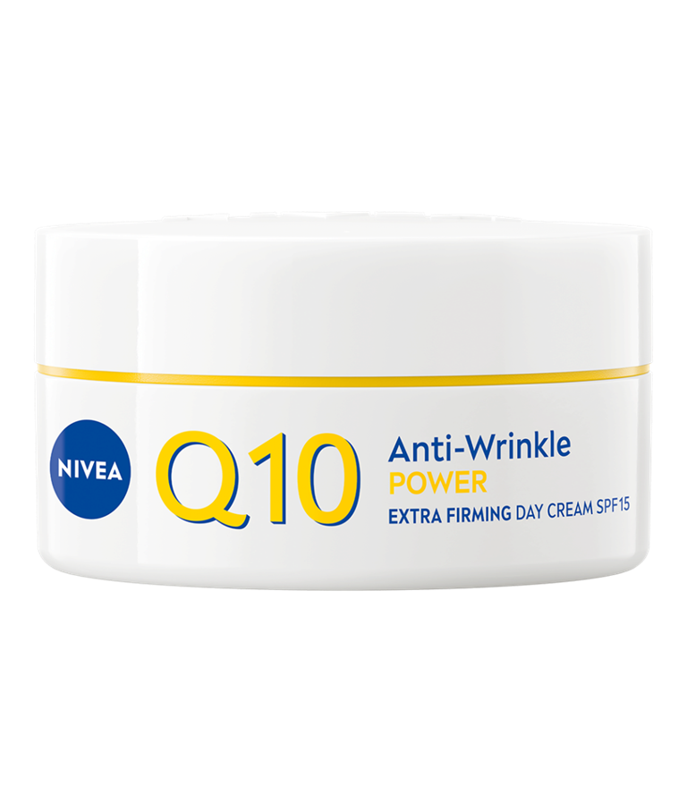 NIVEA Q10 Anti-Wrinkle Power Extra Firming Day Cream med SPF15 er en dagkrem som intensivt gir næring og fukt til huden og reduserer rynker, for en myk hudfølelse og fastere hud. Inneholder dobbel kollagenbooster med ren Q10 og kreatin, Glycostop og hyaluronsyre.