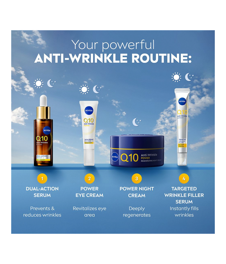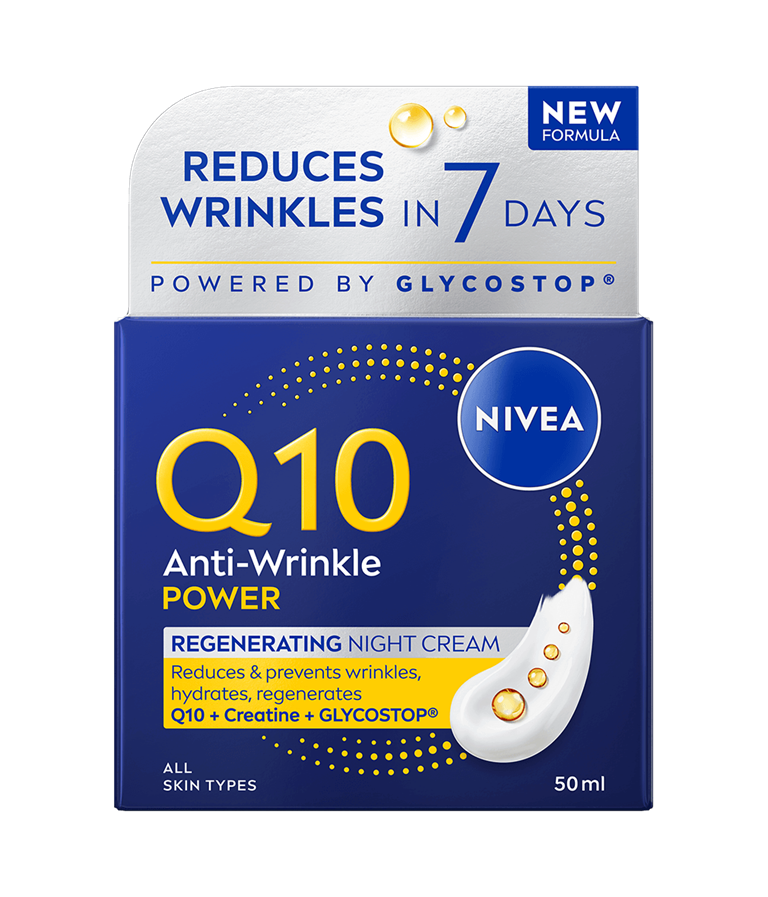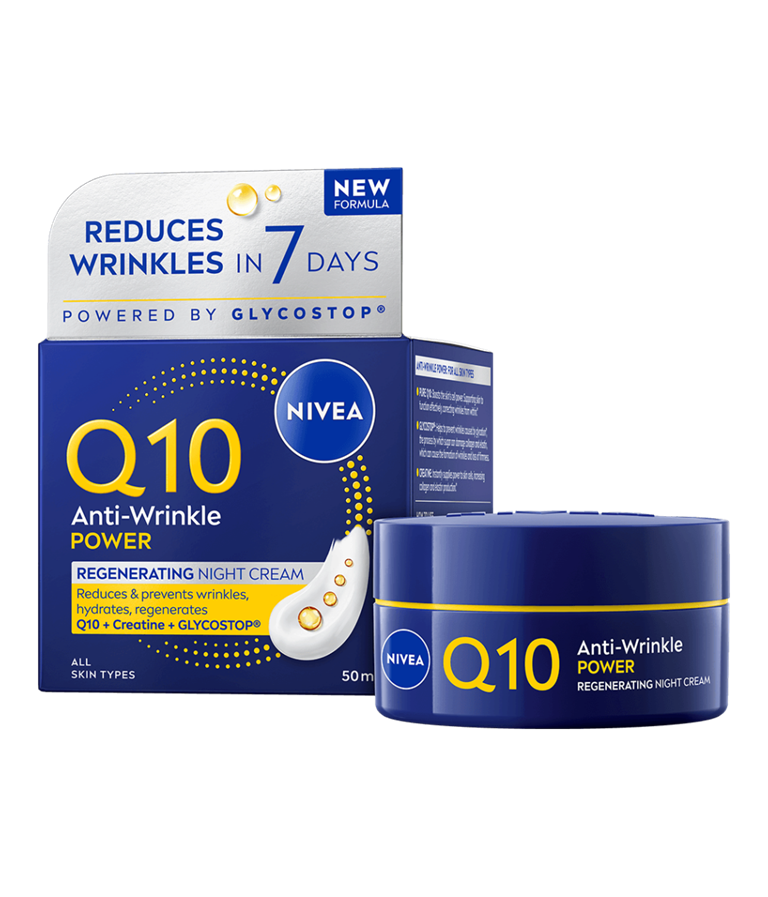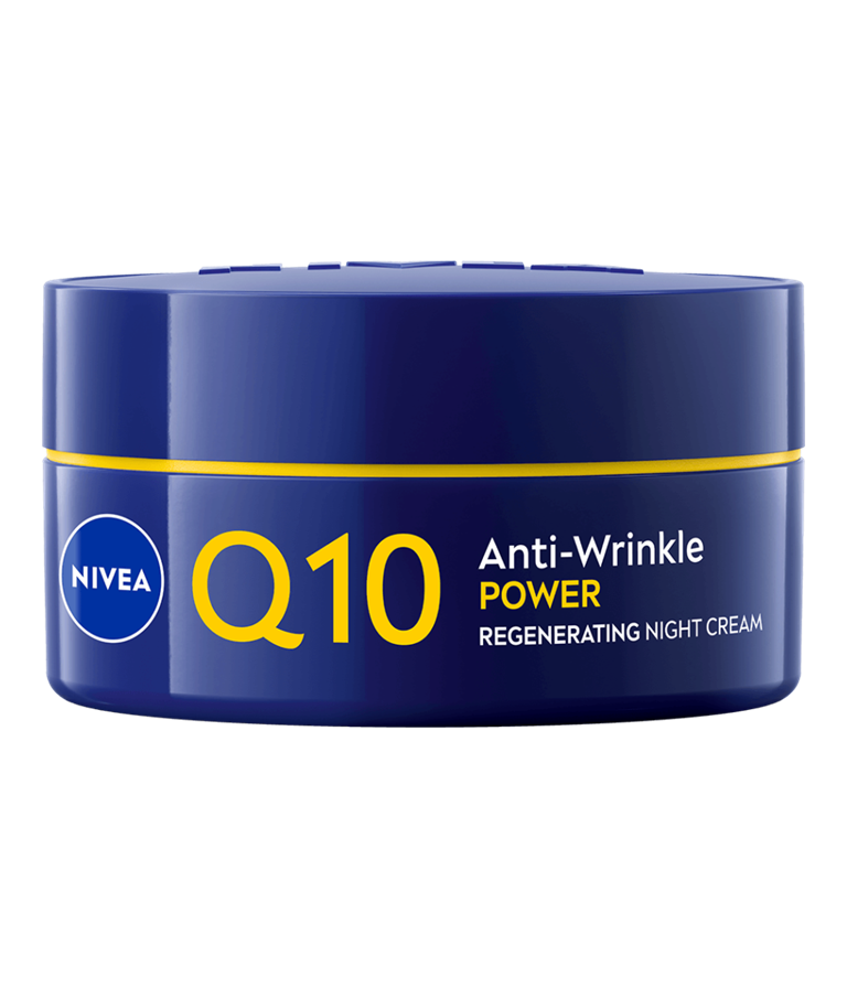 NIVEA Q10 Anti-Wrinkle Power Regenerating Night Cream er en nattkrem som intensivt gir næring og fuktighet til huden for en myk hudfølelse og fastere hud. Inneholder duo-kollagenbooster med ren Q10 og kreatin samt Glycostop og hyaluronsyre.
