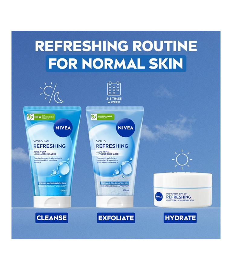 Begynn reisen mot synlig forbedret hud med nye NIVEA Refreshing Scrub. Denne oppfriskende peelingen skrubber bort urenheter i dybden samtidig som den pleier huden din.