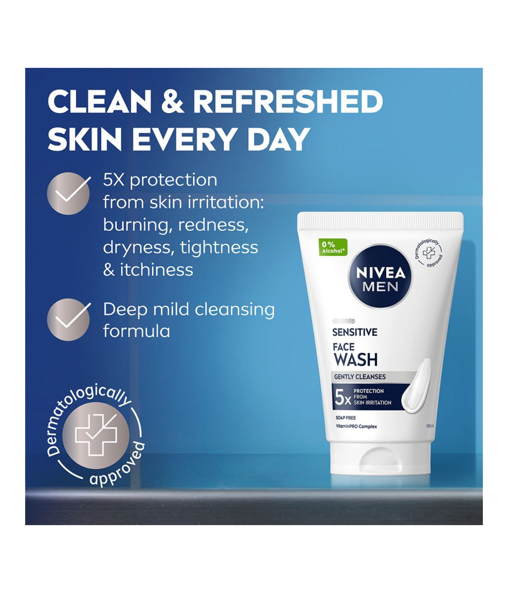 NIVEA MEN Sensitive Face Wash er en skånsom og beroligende ansiktsrens utviklet for sensitiv hud. Den fjerner effektivt urenheter og gir en oppfriskende og behagelig hudfølelse ved hver bruk