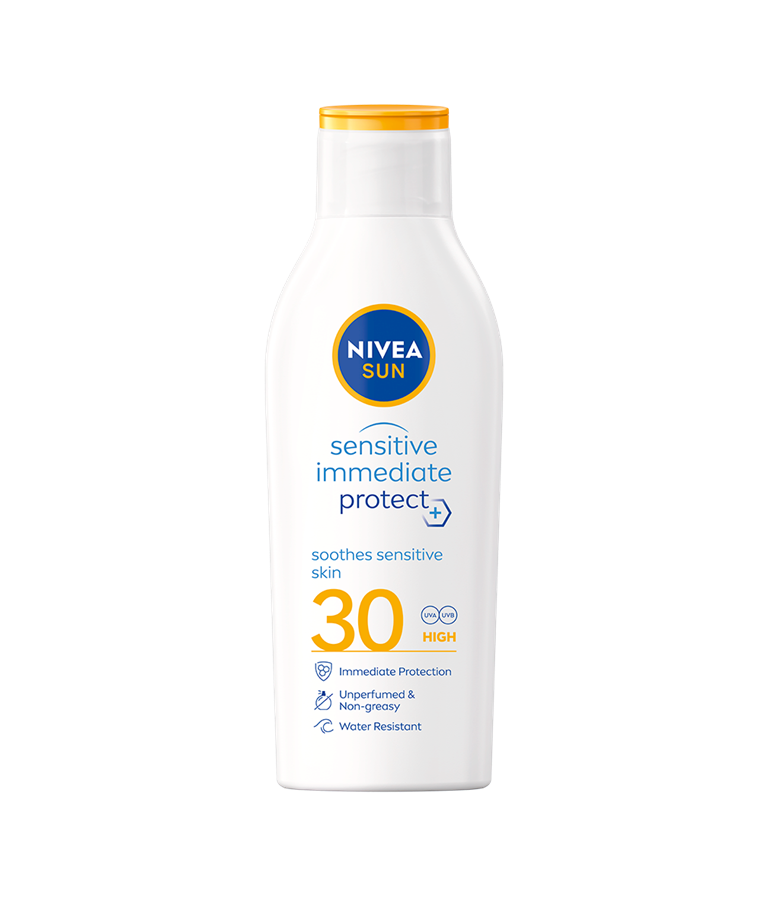 Beskytter og beroliger sensitiv hud umiddelbart med Bio Aloe Vera og Jojobaolje: NIVEA SUN Sensitive Immediate Protect Lotion Soothing