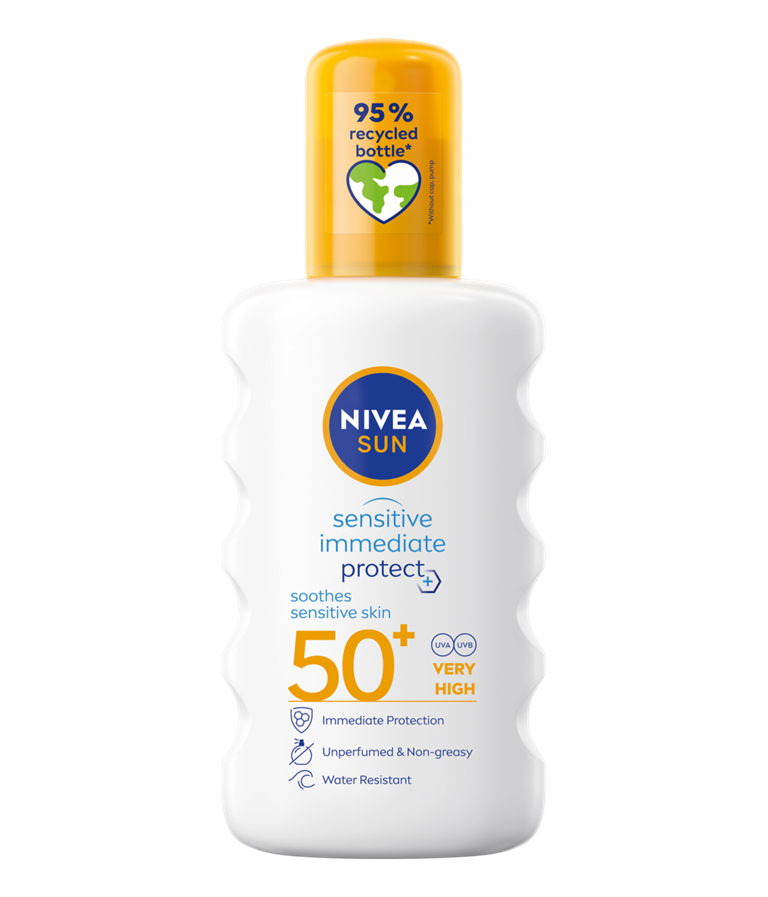 NIVEA SUN Sensitive Immediate Protect Soothing Sun Spray SPF 50+ er en solspray som beskytter mot UVA- og UVB-stråler. Beriket med aloe vera og virker umiddelbart beroligende på sensitiv hud.