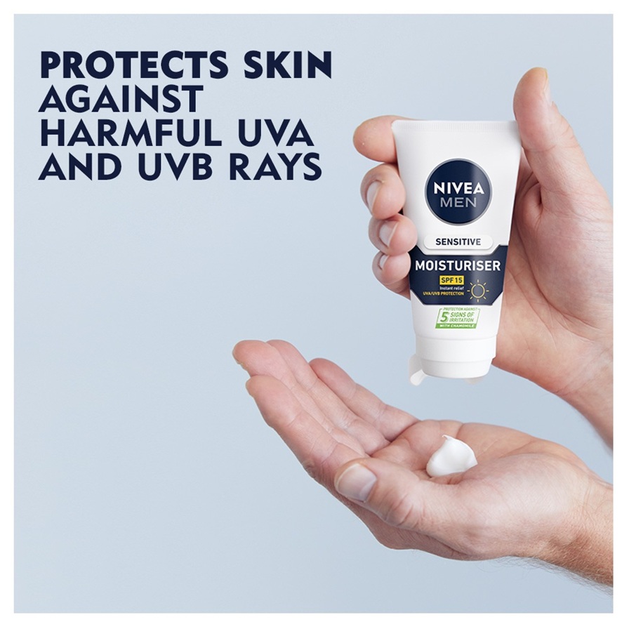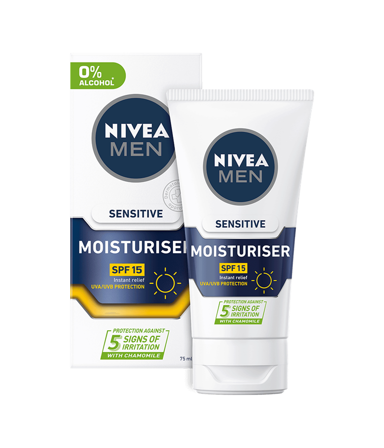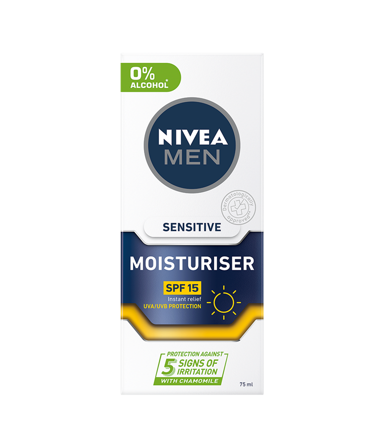 Nye NIVEA MEN Sensitive Moisturiser SPF15 er en beroligende ansiktskrem som lindrer de 5 tegnene på hudirritasjon: svie, rød hud, tørr hud, stram hud og kløe. Fuktighetskremen inneholder SPF 15, som beskytter mot UVA- og UVB-stråler.