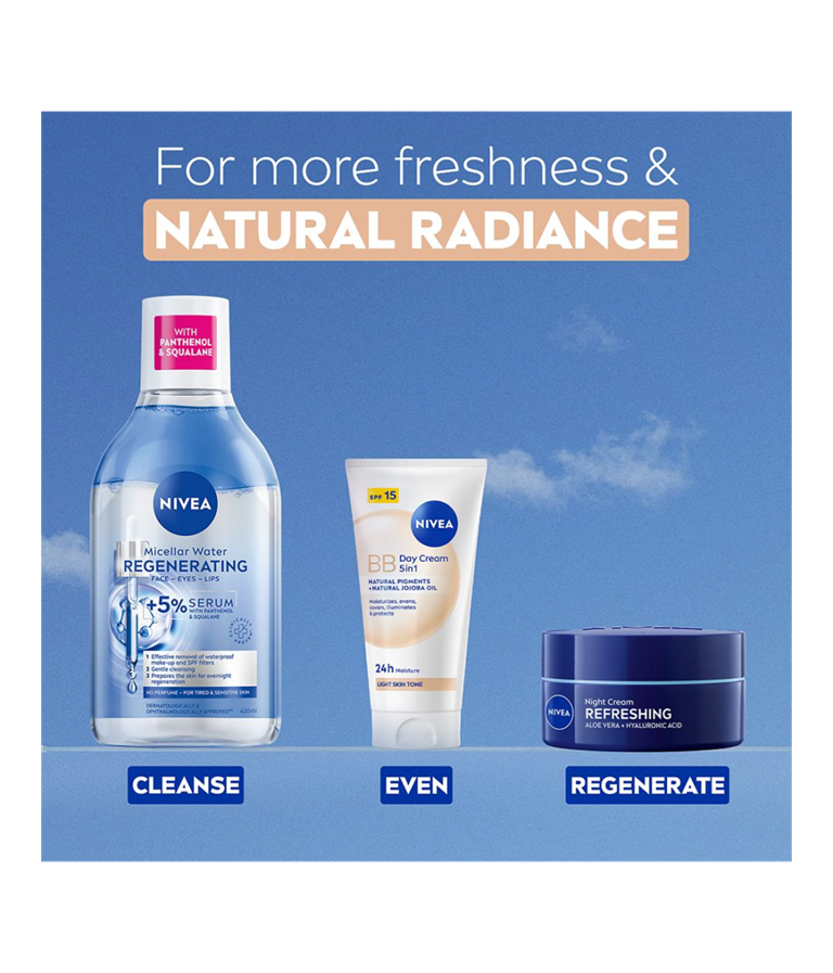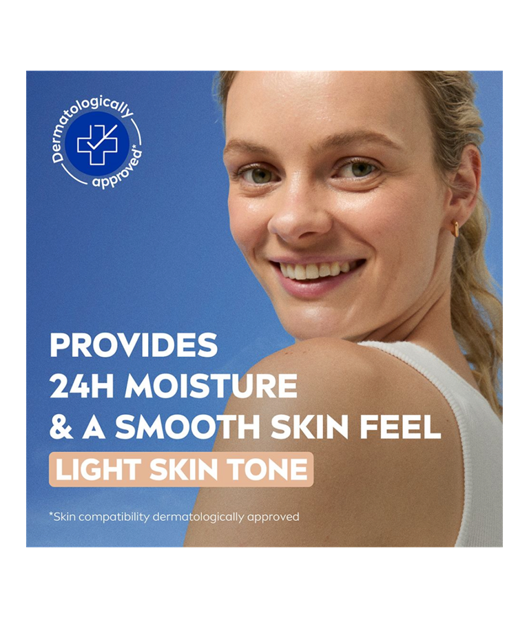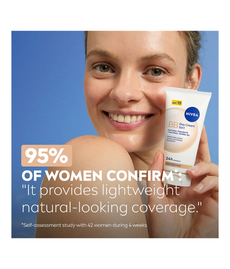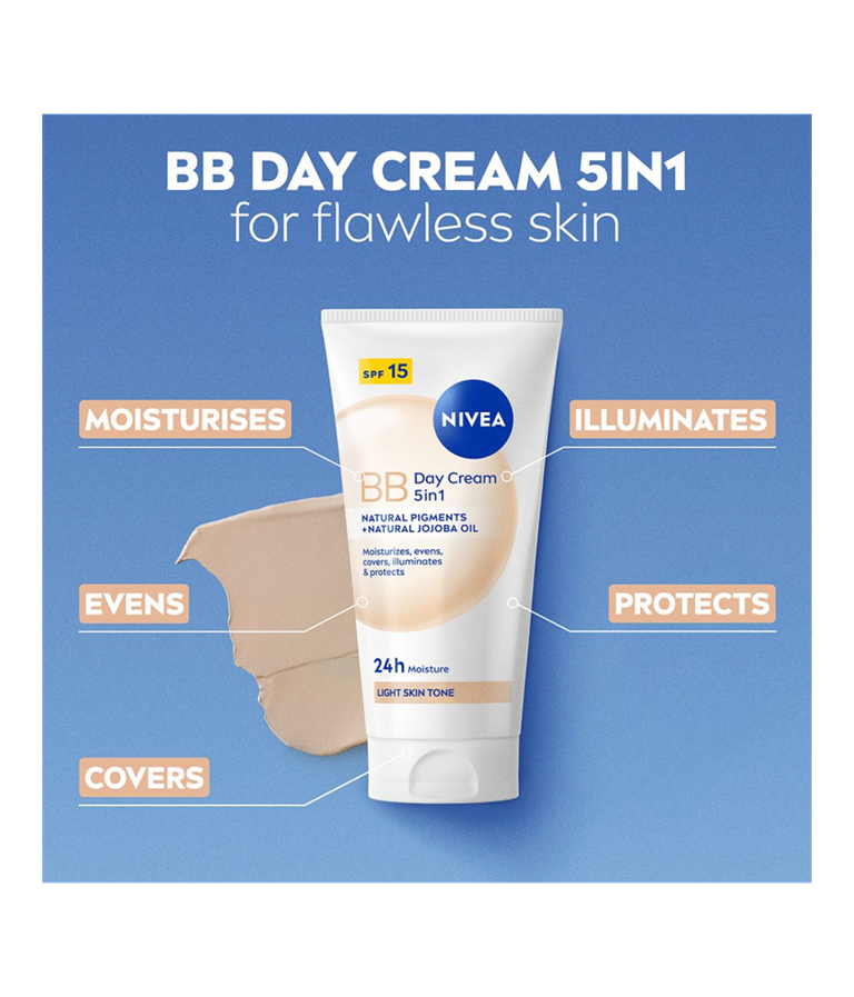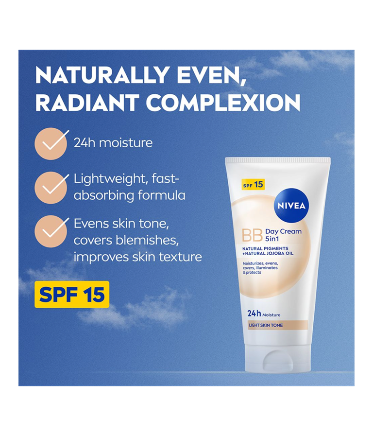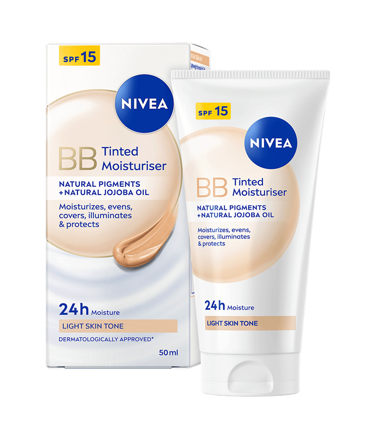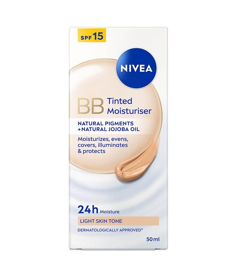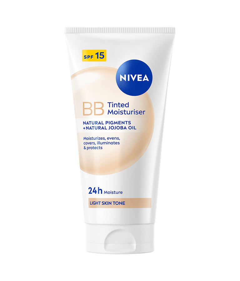NIVEA BB Tinted Moisturiser Light er en farget dagkrem som passer godt for lyse hudtoner. Den jevner ut hudtonen og dekker ujevnheter som tegn på tretthet, blemmer og fine linjer, samtidig som SPF 15 beskytter mot solens UV-stråler.