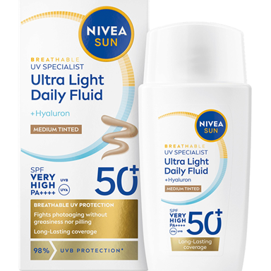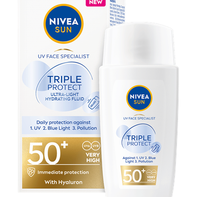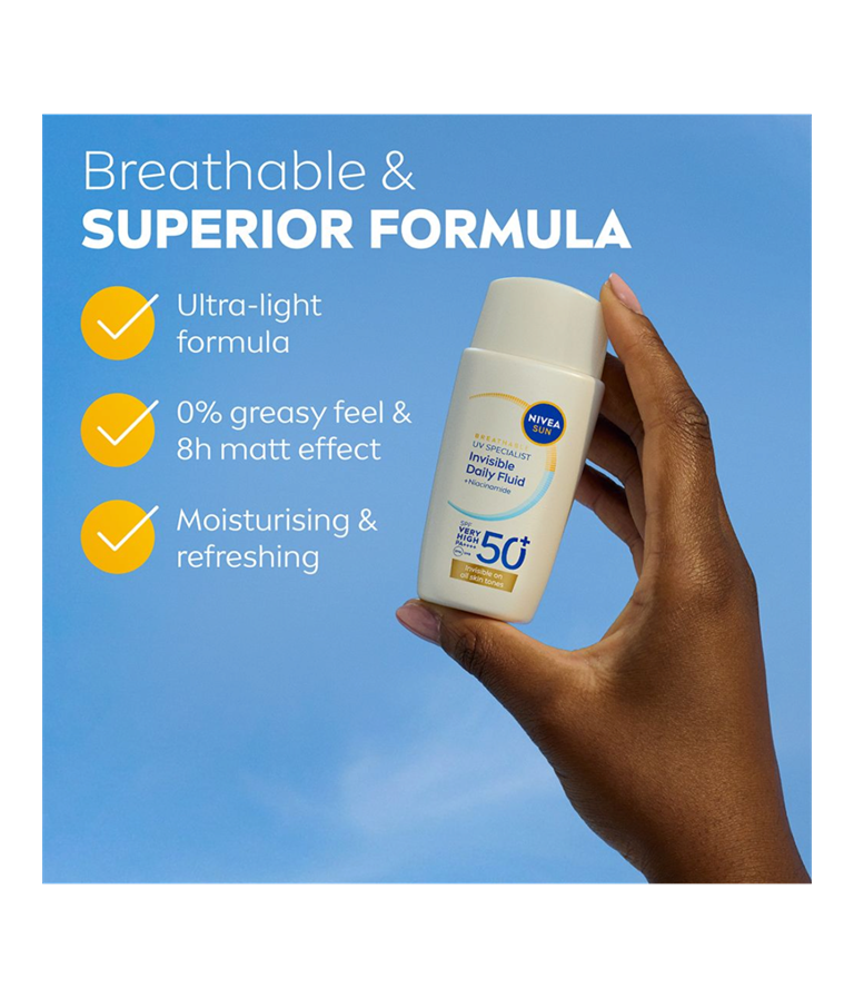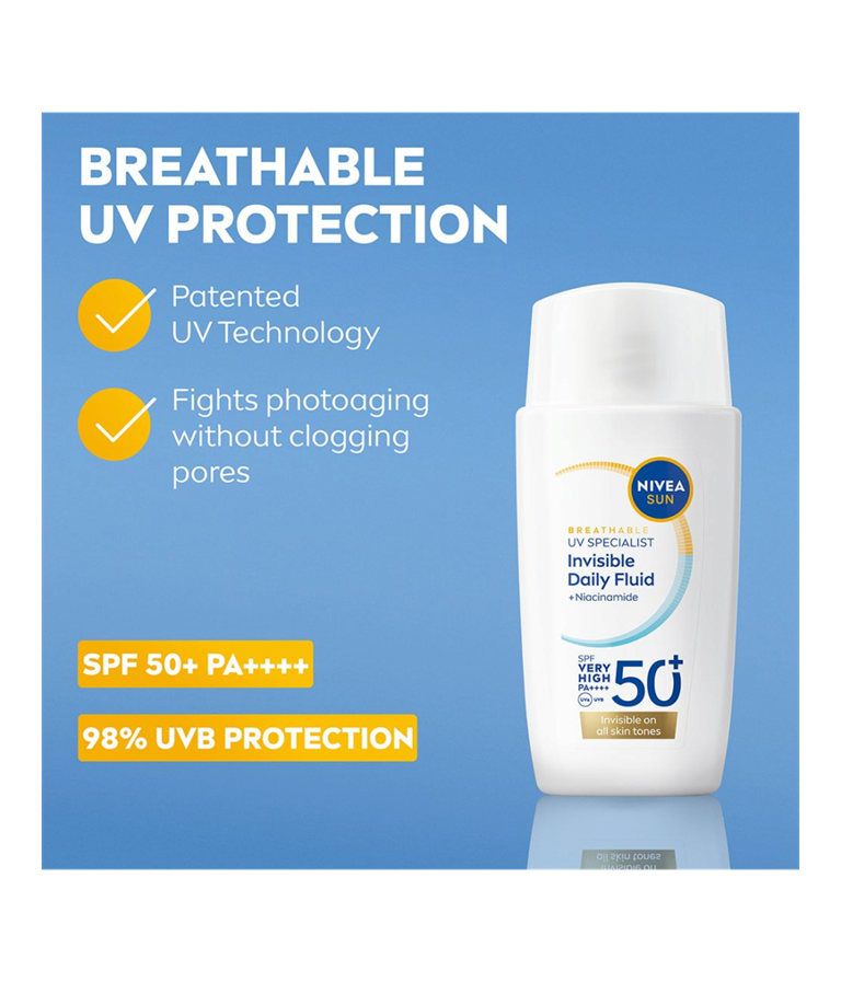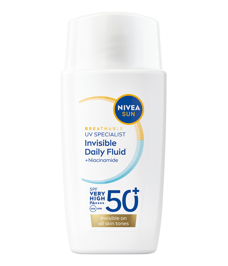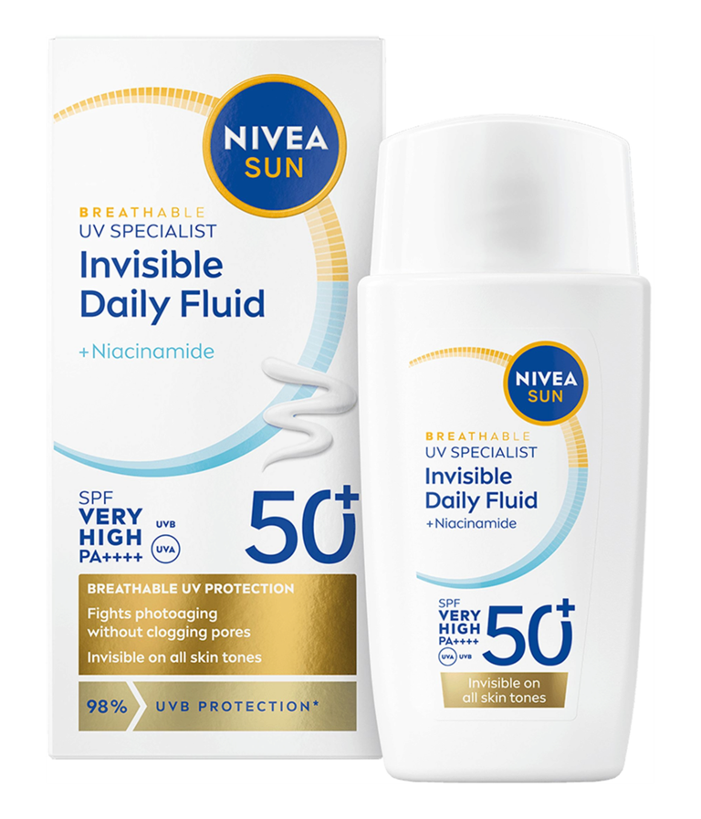 NIVEA UV Face Invisible Daily Fluid SPF 50+ er en solkrem for ansiktet med SPF 50+ som gir umiddelbar beskyttelse mot UV-stråler og fotoaldring. Formelen inneholder niacinamid som bekjemper tette porer og urenheter, uten å etterlate en klissete hudfølelse.