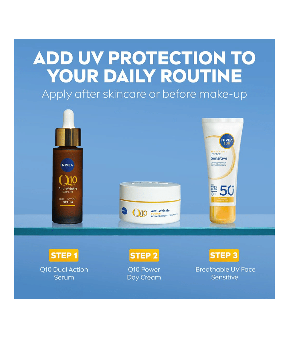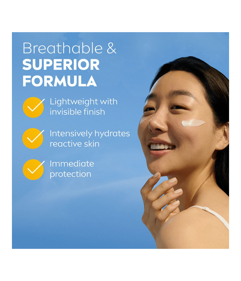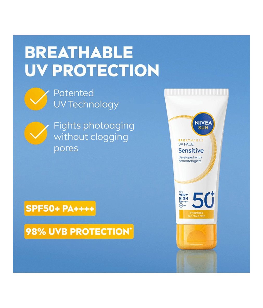 NIVEA UV Face Sensitive SPF 50+ er en solkrem for ansiktet med SPF som gir svært høy beskyttelse mot UVB-stråler. Den har en lett og ikke-fet formel som fukter sensitiv hud og motvirker solallergier. Med sin effektive sammensetning er den perfekt for daglig bruk og beskytter huden mot solens skadelige stråler.